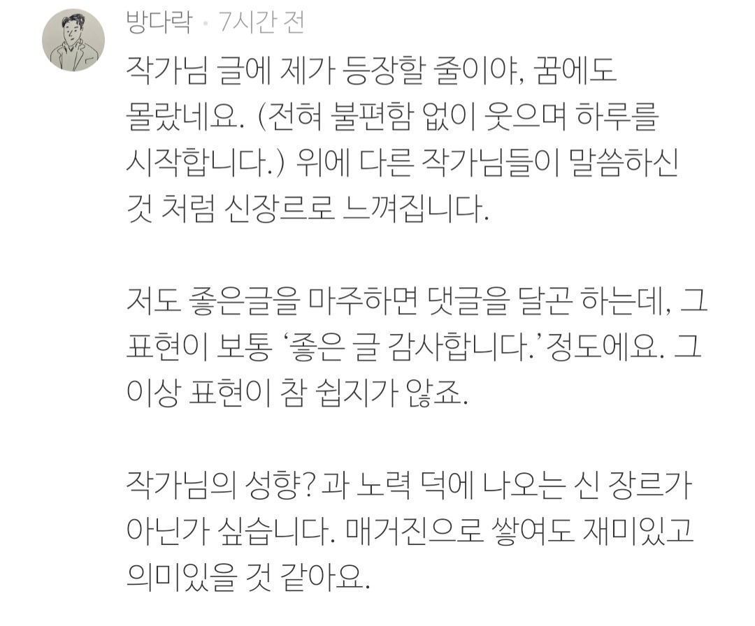 방다락 님은 작품 수로 보아 브런치 카페에 들어온 지 얼마 되지 않은 작가님이다.