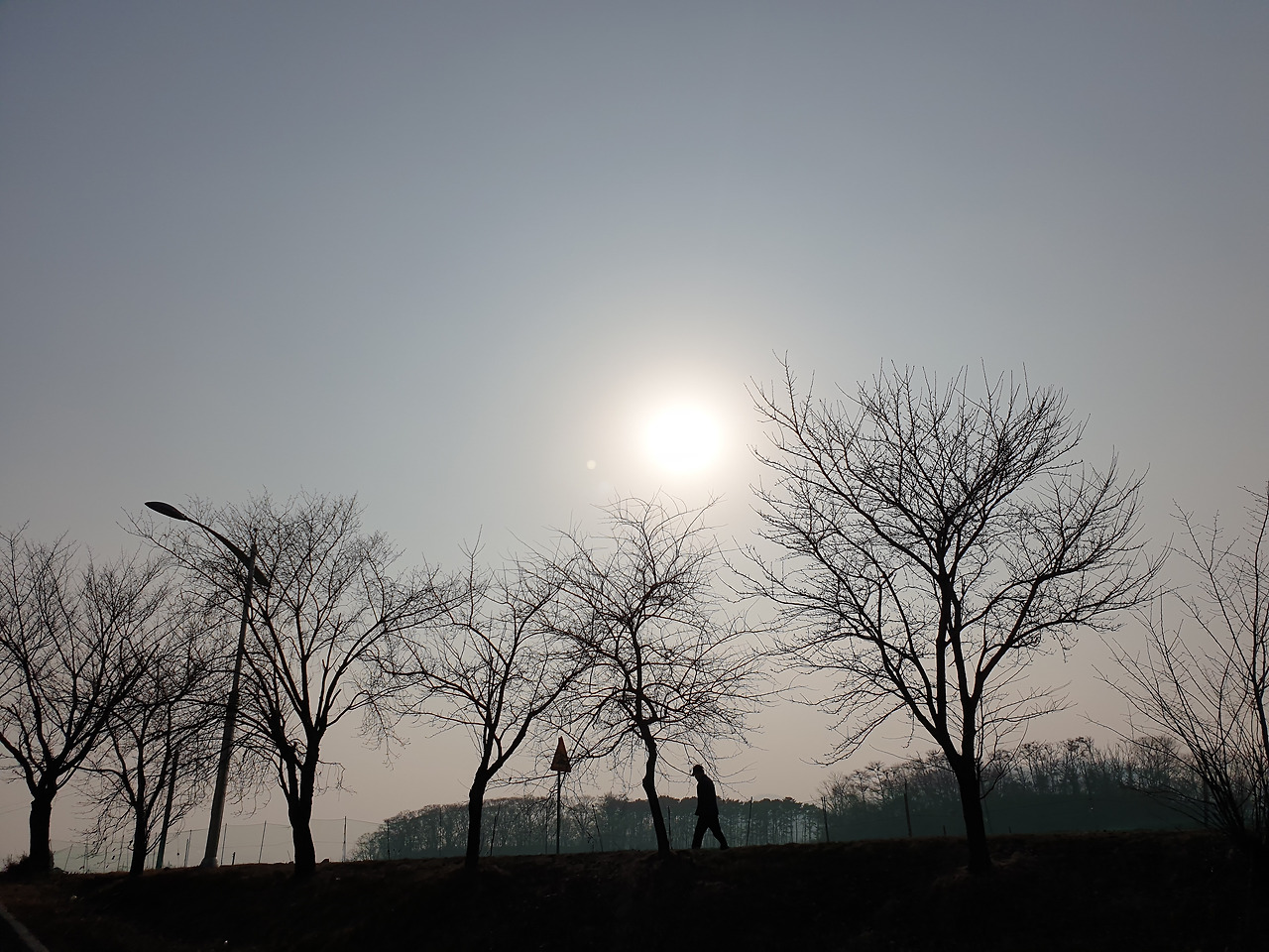 언덕 위 산책길엔 나목들 사이로 황금빛 태양이 천천히 가라앉고 있었다