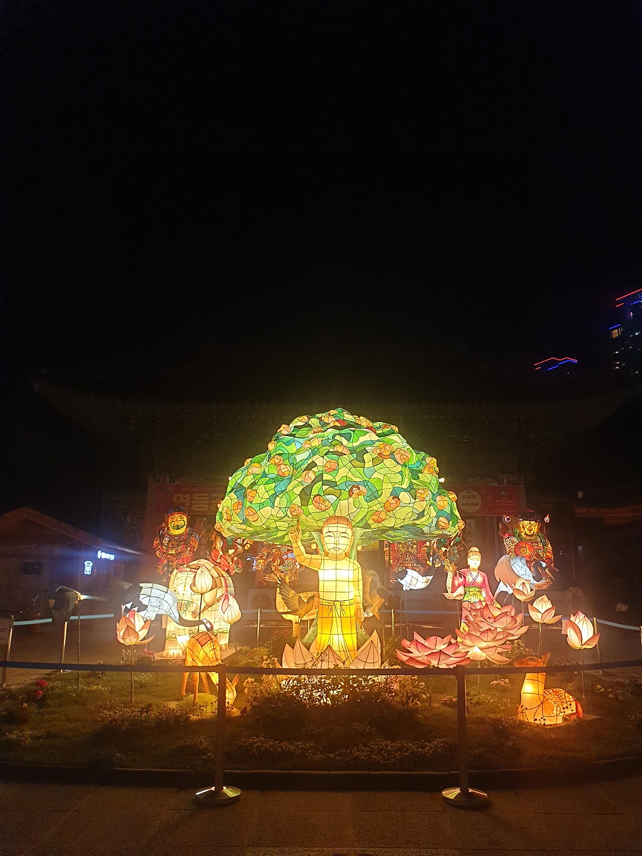 절 초입에 지등으로 아기 부처와 룸비니 동산이 조성된 조형물 앞에서 한 가족이 사진을 찍고 있었다. 엄마인 듯 한 중년 여성이 핸드폰으로 젊은 커플을 찍었다. 갑자기 오지랖이 발동했다.