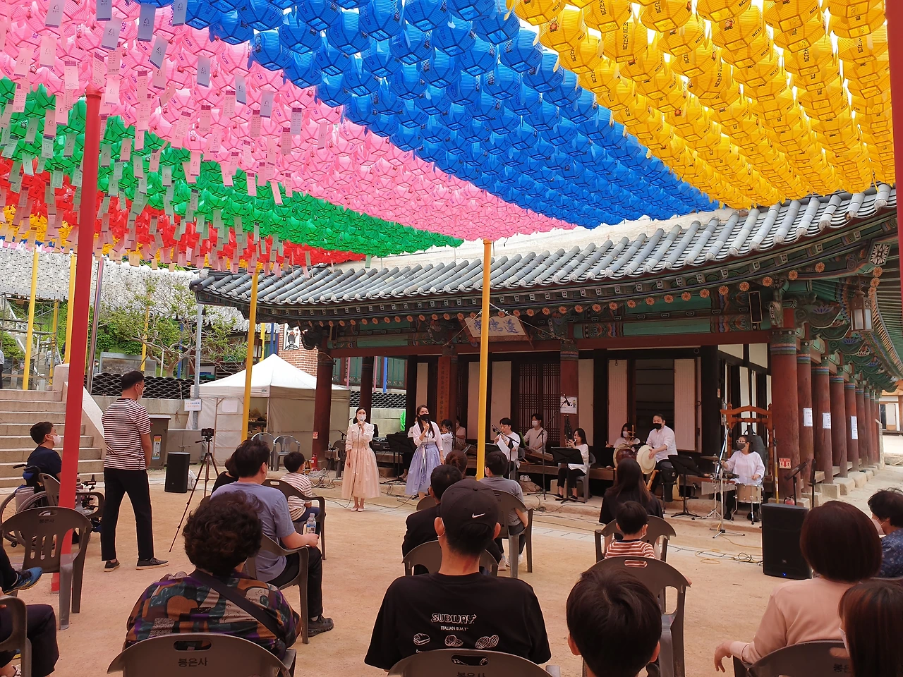 종무소를 지나 대웅전 앞마당으로 올라서니 국악기 선율이 울려 퍼진다. 마당 오른쪽 전각인 선불당 마루에 봉은사 국악기 단원들이 정좌했고 창하는 아가씨 둘이서 고운 개량한 복을 입고 마이크를 들고 있었다. 아쉽게도 마지막 공연인 찬불가 순서란다. 젊은 단원들의 섬섬옥수가 악기에 얹히고 그 가락에 아름다운 목소리가 덧입혀져서 새소리처럼 울려 퍼졌다.