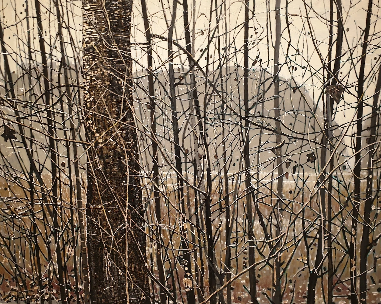 전시장 한 면을 가득 메워 섰던 겨울 나목들. 그 등뼈 끝 언저리에 진주처럼 까치집들이 맺혀 있어 생명의 온기를 유지하고 있었다. 너와 나의 마른 뼈로 서로 기대어 겨울 언덕을 지켜내는 광경을, 작가는 보여주려고 하지 않았을까?