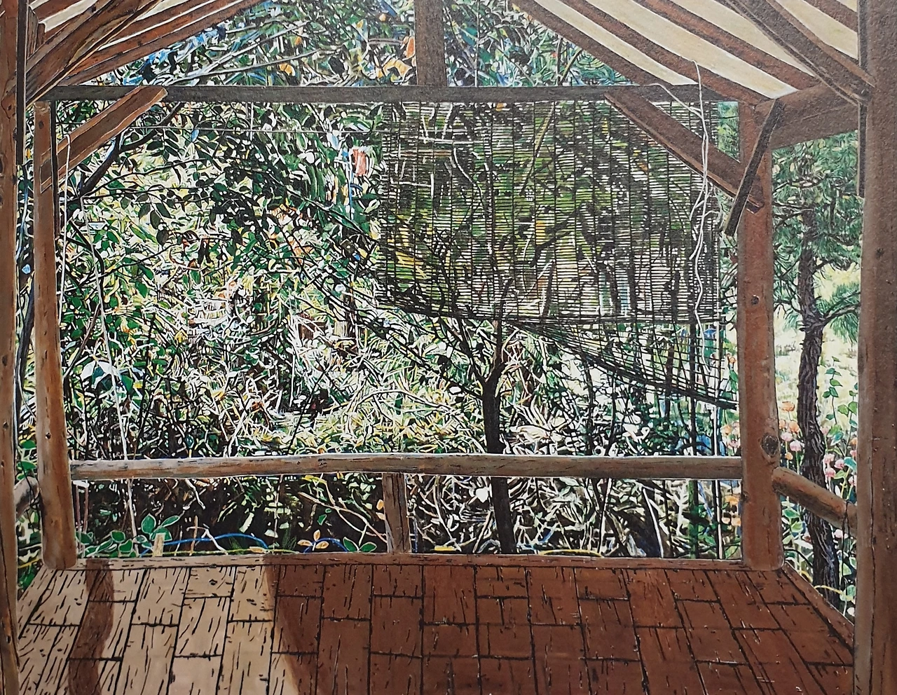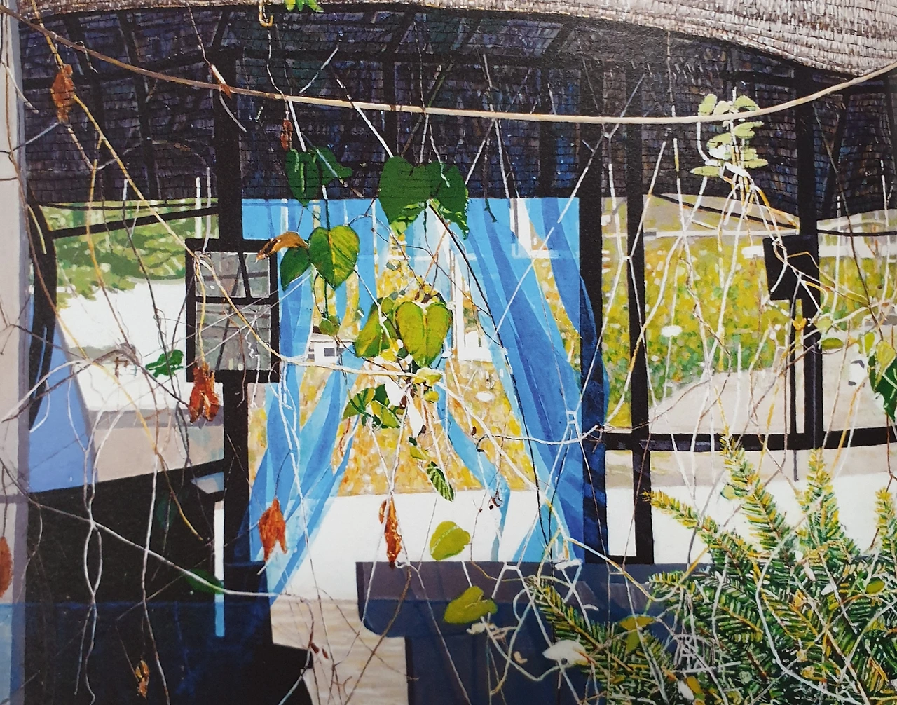 초록색과 뜨거운 빛은 대표적으로 여름을 상징한다. 그 솟아나는 생명력의 분출을 파란 그늘망이 식혀 주며 수위를 조절한다. 아래 그림은 청춘의 불꽃과 야망을 갈무리하기 시작한 작가의 연대기가 아닐까?