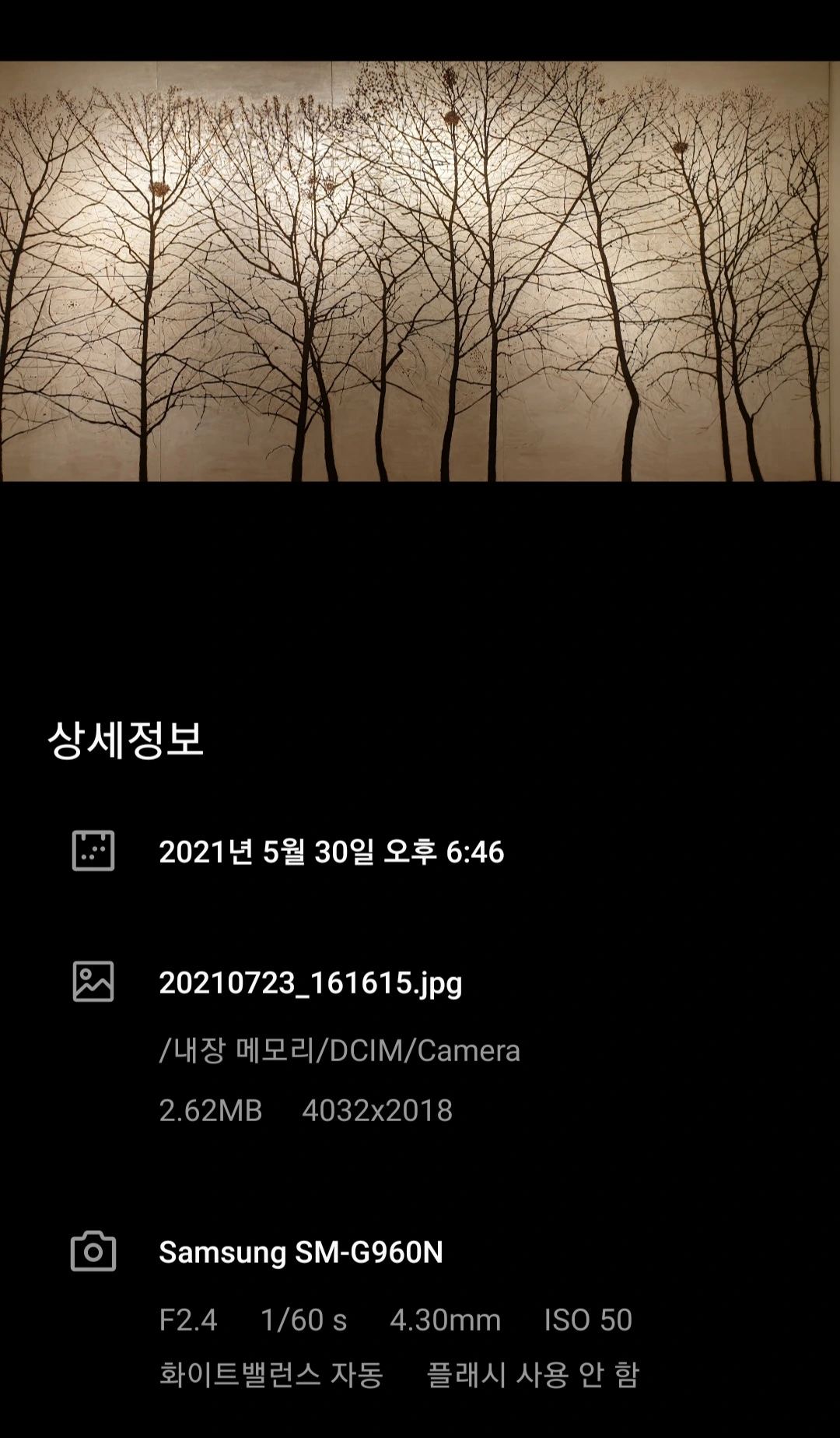2.62MB의 용량으로 나목군 그림이 저장되었음을 알 수 있다. 또한 촬영 날짜와 시간 데이터는 기본적으로 저장되어 있다. 계절의 여왕 5월의 마지막 날. 그때의 사진은 한때 빛나던 계절을 간직한 사진 이상의 것이 되었다.