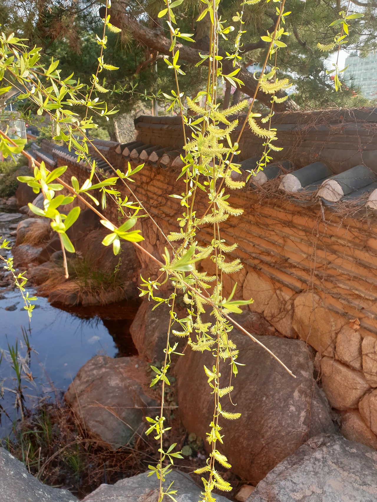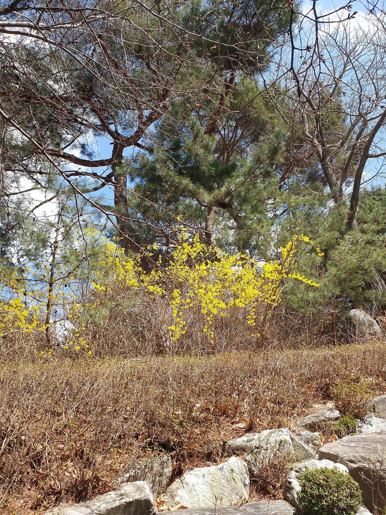 멀리 연초록 작은 잎으로 장식한 능수버들이, 군락으로 피어나는 샛노란 개나리꽃이,