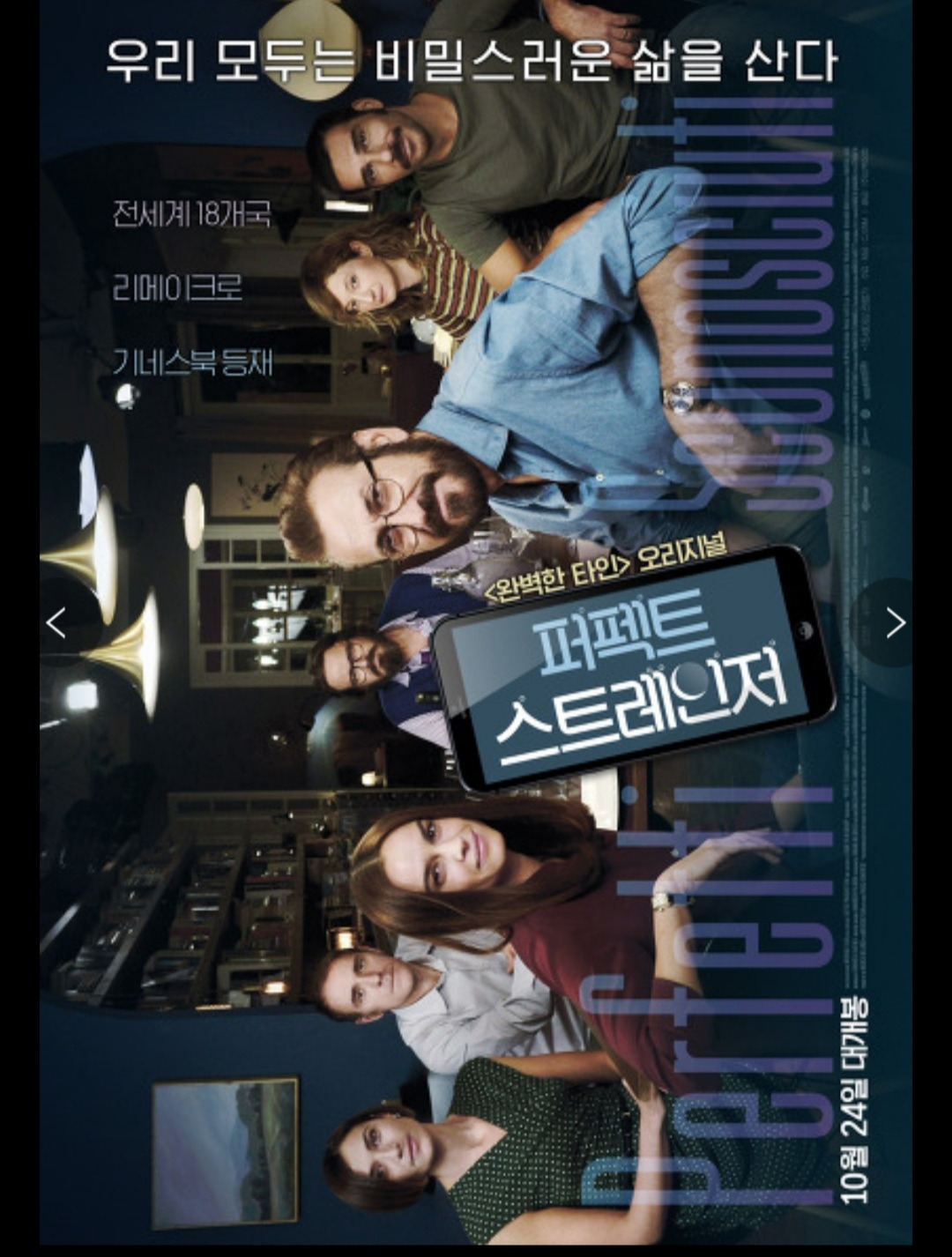 그저께는 25일 즉 크리스마스였다. 언제나 흥분과 기대가 고조되는 축제 전날과는 대조적으로 축제 다음 날에는 마치 바람 빠진 풍선 같은 기분이 든다. 어제가 바로 그런 날이었다. 감정적으로 처져버린 느낌을 받으며 소파에 앉아 리모콘 단추를 누르다 보니 영화 채널에 도달했다. 화면에서는 next~ <완벽한 타인>을 자막으로 예고하고 있었다. 처음부터 감상할 수 있는 기회였다.