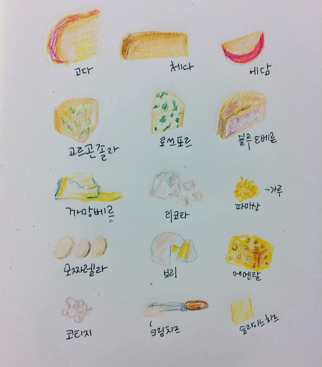 집에 와서 노란 아이들의 이름을 나열해봤다. 관련 지식도 찾아봤다. 치즈는 기원전 2300년부터 있어온 먹을거리라고 한다. 치즈는 우유와 박테리아의 만남이라니 너무 매력 있었다.