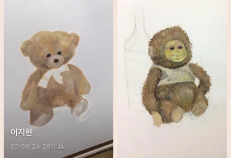 삼십 대부터 그림을 시작해서 조바심도 있었고, 스스로 '후훗 난 천재'라고 생각했다가도 안 그려지는 날도 있고 혼자 그림과 씨름하던 날도 있었어. 그렇게 1년 반 정도 화실을 다닌 거 같아. 우연히 사진 정리하다가 작년에 그린 곰인형이랑 올해 그린 원숭이 인형 그림을 비교할 수 있었어. 큰 성장이 없다고 생각했는데, 되게 확연히 차이나더라.