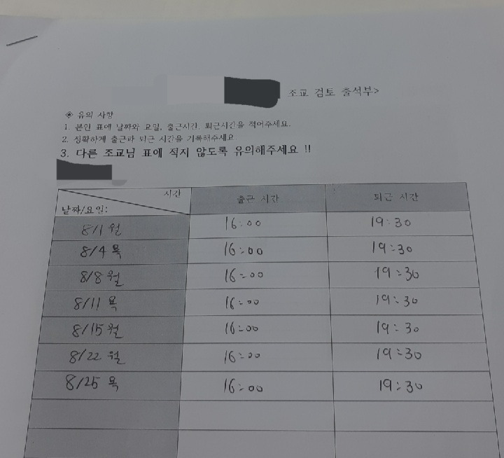 필자의 8월 검토 업무 출석부, 한 번도 빠지지 않았다.