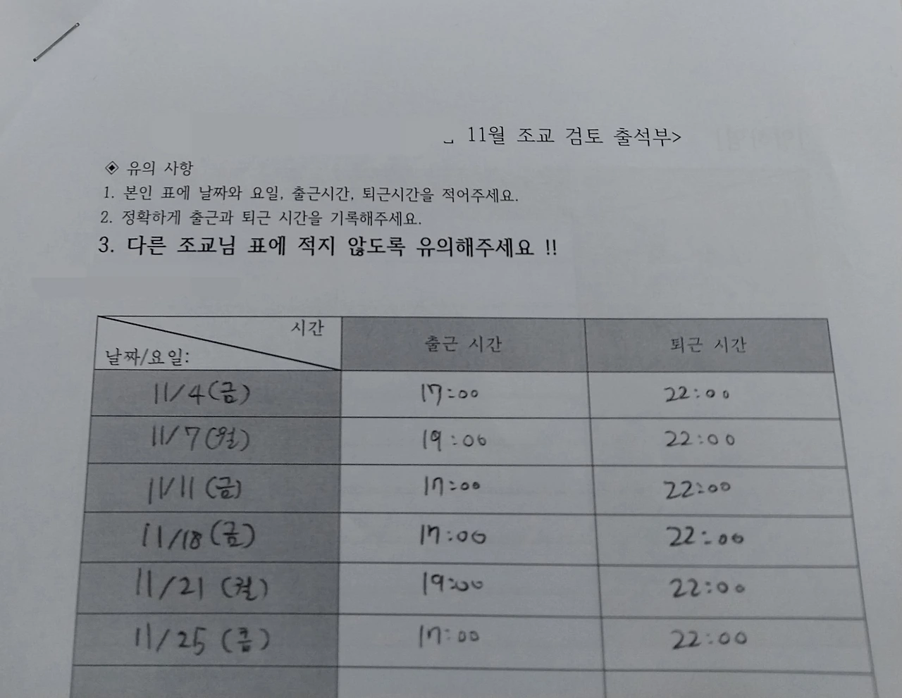 필자의 11월 검토 업무 출석부, 8월 검토 업무 때와 달리 업무 시간이 달라졌음을 알 수 있다.
