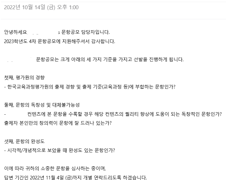 문항공모 접수 확인 메일에서도 '문항 채택에 필요한 요건'을 밝혔다.