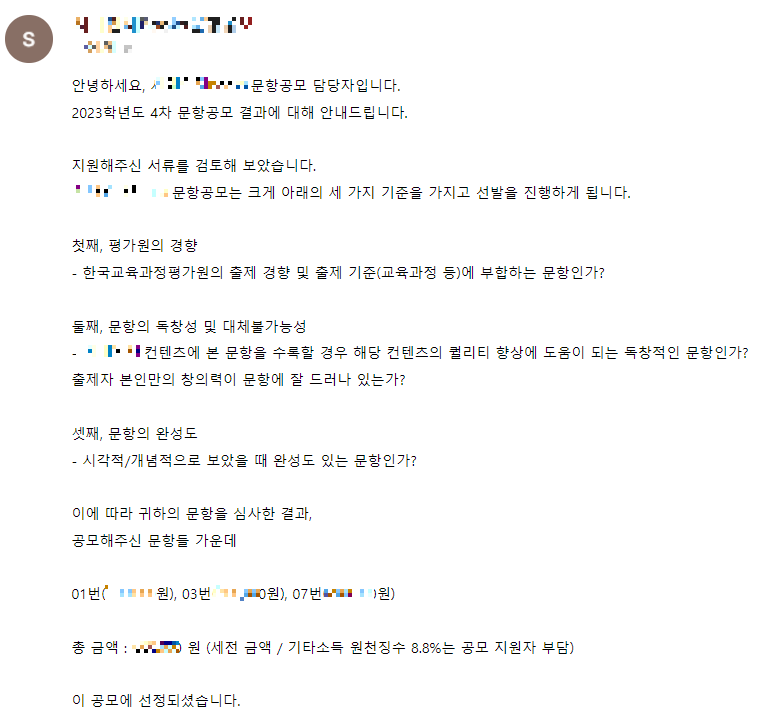 문항공모 채택 확인 메일, 7월에 받은 팀 검토진 합격 메시지를 받았던 때만큼 기뻤다.