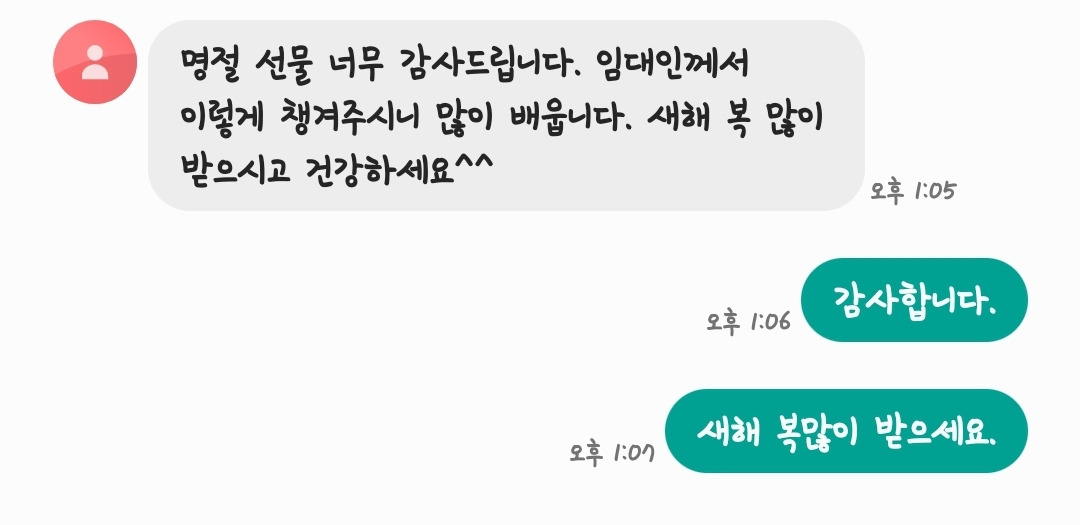 건물 인수 후 2년 동안 살고 계신 세입자 분들께 명절에 선물세트를 보냈다. 상상외로 반응이 좋아서 행복했지만 세입자분들이 자주 바뀌면서 의욕을 잃어 더 이상 일괄로는 선물을 보내지 않는다.