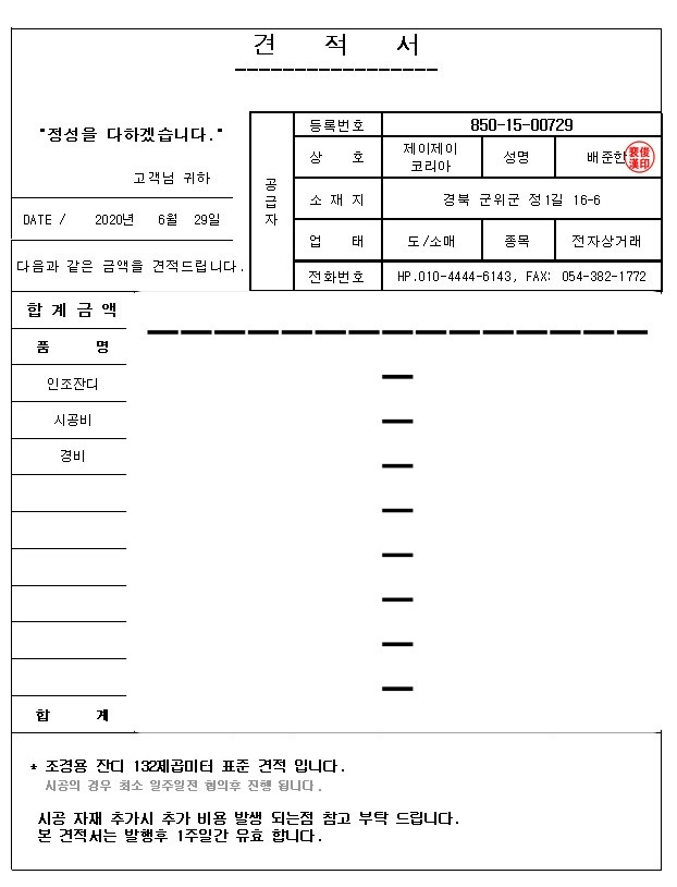 옥상을 꾸미기 위한 인조잔디 계약서 (금주 시공 예정)