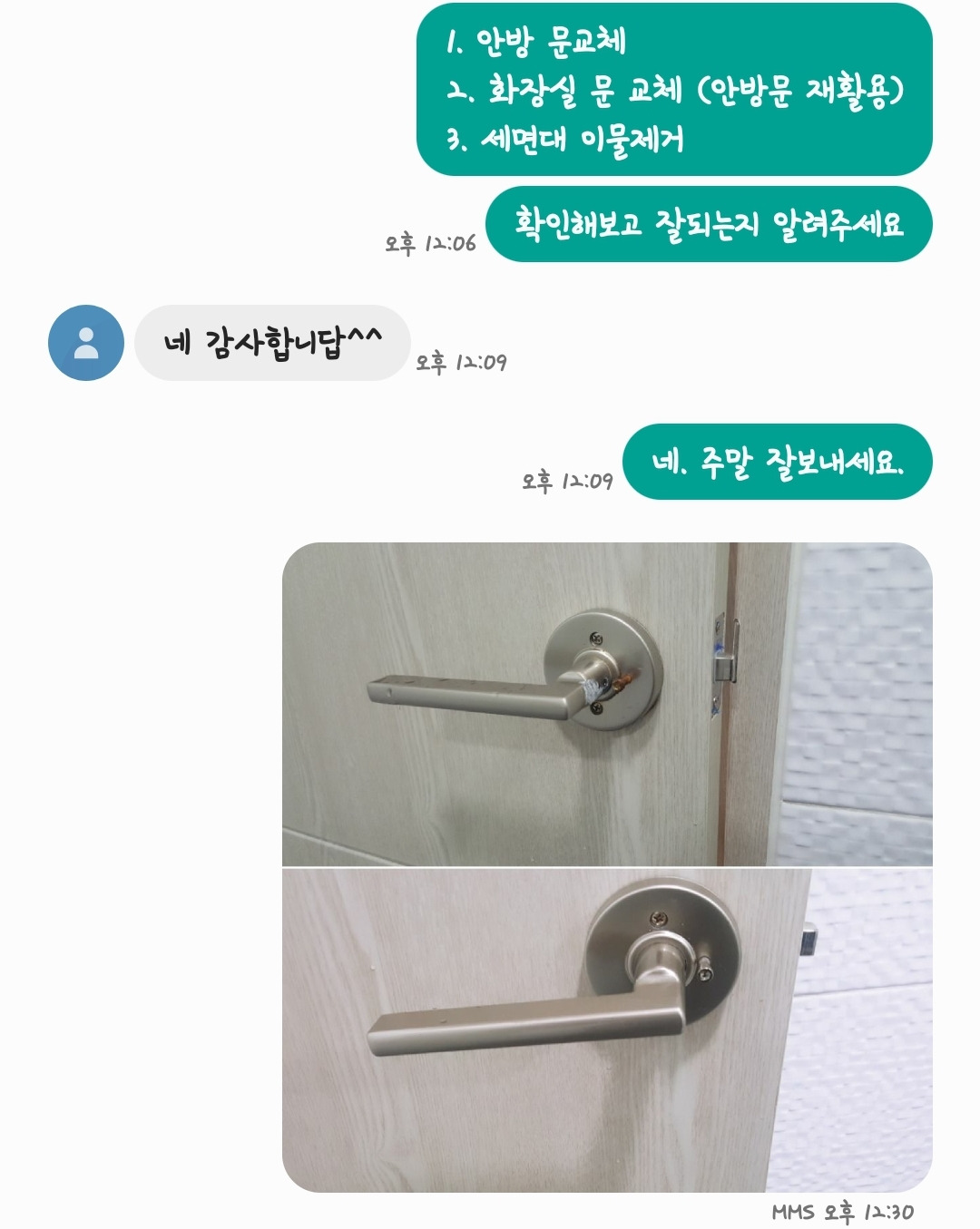 세입자분들이 살면서 수리가 필요한 부분이 있으면 불편한 마음으로 나에게 연락한다. 그럴 때면 나는 최대한 친절하게 답변하고 빨리 조치를 취한다. 문 손잡이 교체, 변기 커버 교체, 문 상태 이상과 같이 간단하지만 처음 해보면 어떻게 해야 할지 막막한 일들을 내가 직접 처리해드렸다. 유튜브에 관련 영상이 많아 조치 방법을 쉽게 알 수 있다. 사실 링크만 보내면 되지만 나는 직접 가서 조치하는 것을 선호한다. 나의 이런 행동에 세입자가 만족하고 기분이 좋아지길 기대하는 마음에서다.