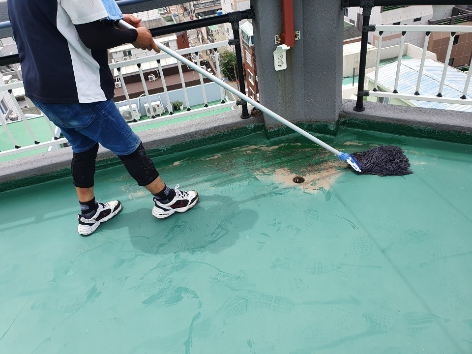 나는 직장 근무로 인해 시공할 때 곁에 있지는 못했지만 시공 팀장님께서 고생해주셨다. 우선 옥상 잔디 시공 전에 바닥을 깨끗하게 닦아 주셨다. 바닥이 지저분하면 바닥과 잔디가 분리되어 미관상 좋지 않다. 그 후 잔디를 길이에 맞게 펼치고 재단하여 틀을 잡아 주신다.