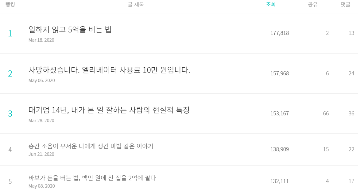 브런치 작가에 선정된 것은 2월 말이었고 본격적으로 브런치에 글을 쓰기 시작한 것은 3월부터였다. 중간에 쉬는 기간을 제외하고 4달 만에 누적 조회수가 160만이 되었다.