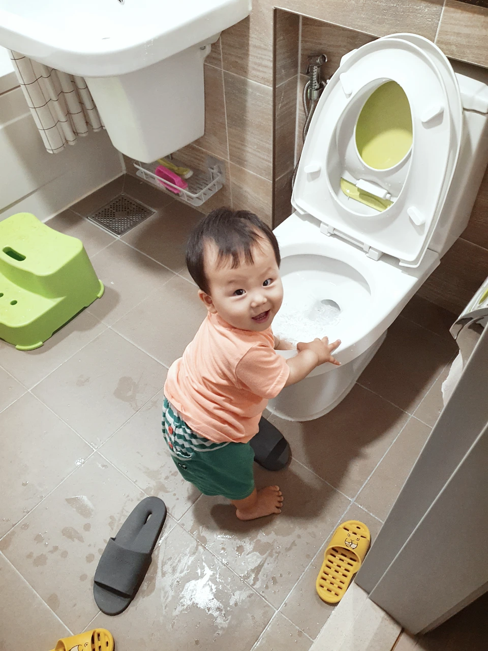어느 날 아이의 소리가 들리지 않아 어디에 있는지 찾아봤더니 화장실에서 변기에 손을 넣어 물장난을 치고 있었다. 욕조에서 하는 물놀이를 좋아해서 혼자 두면 화장실 변기에서 논다고 한다.