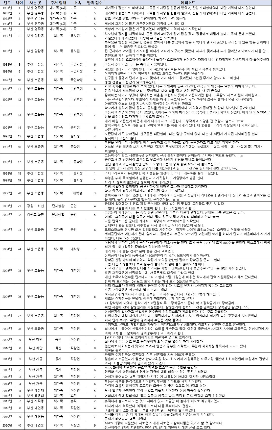 부모님은 빵집을 하셨는데, 용돈을 받아서 다른 빵집에서 빵을 사 먹다가 걸려서 혼난 것이 생각난다. 우리 집에 있는 빵은 공짜니 집에서 마음껏 먹으라고 하셨다. 한 번은 집 근처에서 아이들과 싸우다가 머리에 도구(?)로 맞았다. 피부가 찢어져서 피가 많이 났고 아버지가 나를 안고 병원으로 가서 급하게 피부를 꿰맨 적도 있다. 초등학교 입학 전의 일이니 부모님께서 많이 놀라셨을 것이다. 집 앞에 세워진 오토바이에 올라가서 놀다가 오토바이가 넘어졌다. 다행히 나는 안 다쳤지만 아버지께서 다 보상해주셨다.