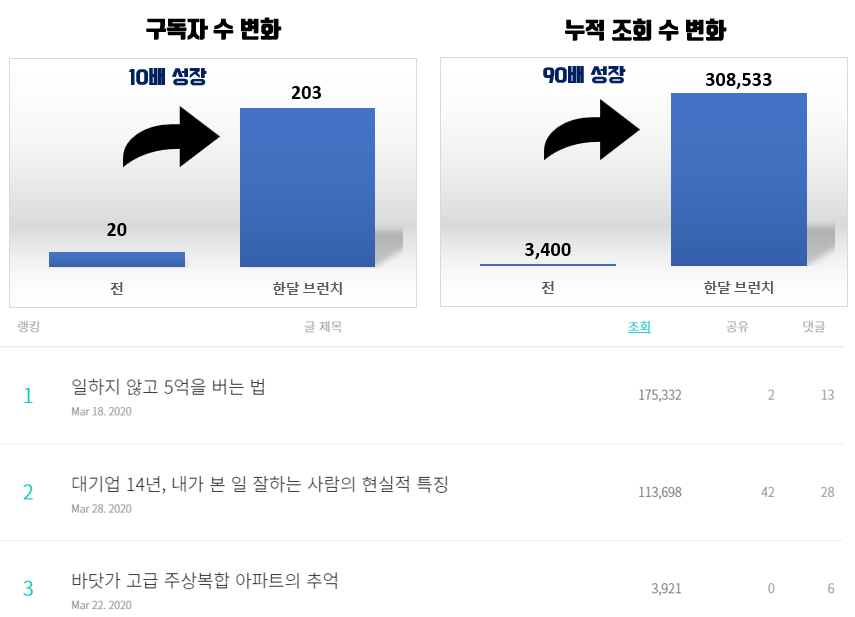 2월 중순에 브런치 작가에 선정되었다. 한달 4기 팀원들로부터 팁을 얻어서 브런치에 겨우 합격했다. 한달 5기 때는 한달 브런치와 자기발견 과정에 참여했고, 보름 만에 엄청난 성과가 있었다. 구독자가 20명에서 230명 이상으로 10배 이상 늘었고, 누적 조회수는 90배 이상 상승했다.