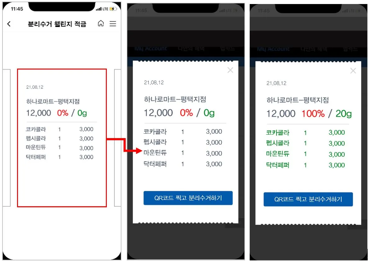 - 올원뱅크 앱 상에서 쓰레기통 QR 코드 찍음 > 바코드 리더 화면 전환 > 자신이 구매한 상품중 분리수거해서 버릴 쓰레기의 찍음 > 종류에 맞게 분리수거