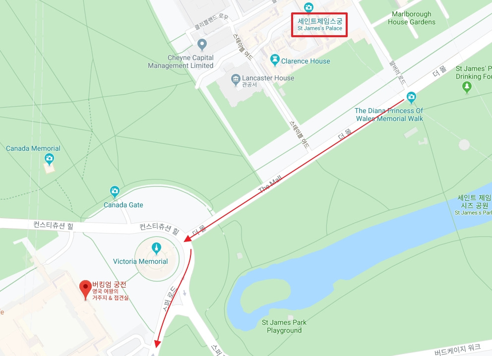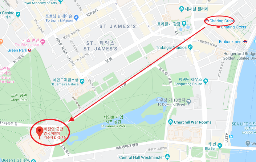 블룸스버리에서 버킹엄 궁전까지 가는 방법은 매우 다양하다. 버스를 탈 수도 있고 버킹엄과 가까운 그린파크 역이나 세인트 제임스 파크 역을 이용할 수도 있다. 그렇지만 런던의 상쾌한 아침 공기를 느끼며 조금 걷고 싶었던 우리는 채링크로스 역에서 내려 대로(지도에 보이는 더 몰 로드)를 따라 쭉 걸어가는 방법을 선택했다. 가는 길에 트라팔가 광장과 애드미럴티 아치도 구경할 수 있는 꽤 괜찮은 루트인데 가는 길도 매우 쉽고, 천천히 걸어서 20분 정도의 거리이기 때문에 간단히 아침을 먹고 걷기에 알맞아서 추천하고 싶다.
