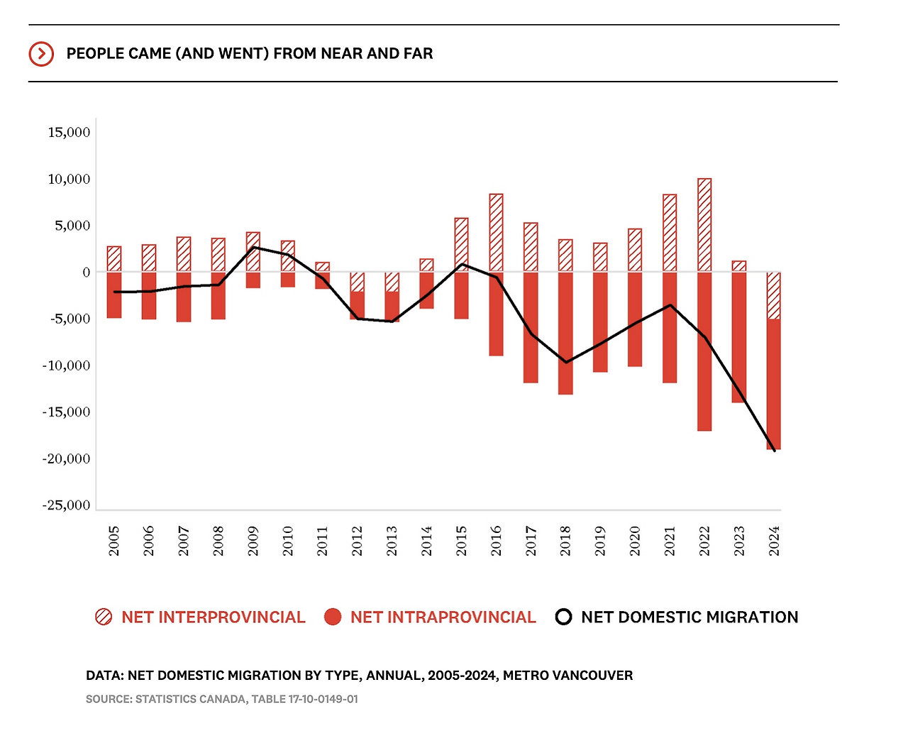 도시별 인구 증감 전망에서 또 하나 중요한 변수는 국내 이주(domestic migration)이다. 국제 이민자의 유입이 앞으로 줄어들 것으로 보이는 가운데, 앞으로 브리티시컬럼비아(BC) 주의 대도시들이 얼마나 성장할 수 있을지—혹은 성장할 수 있을지조차—국내 인구 이동에 달려 있게 되었다.