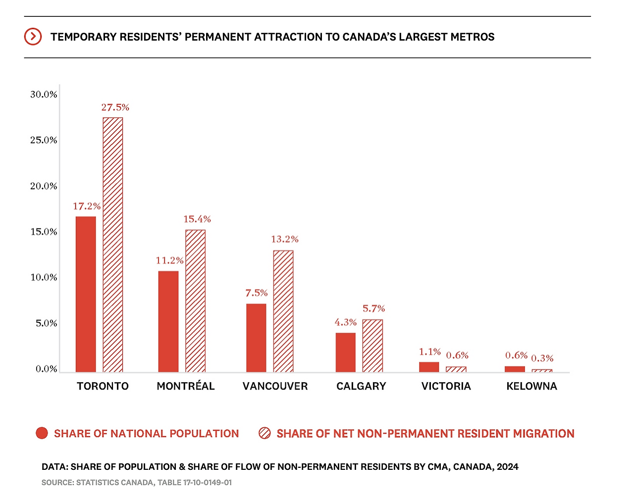 임시 거주자, 특히 비영주권자들은 입국 후 대부분 대도시권으로 집중되는 경향을 보인다. 예를 들어, 2024년 한 해 동안 유입된 비영주권자의 약 1/3은 토론토로 향했으며, 이는 전국 인구의 17%를 차지하는 토론토의 비중을 크게 상회하는 수치이다. 밴쿠버 역시 그 규모에 비해 높은 비중을 차지했으며, 반면 빅토리아(Victoria)와 켈로나(Kelowna)는 상대적으로 비영주권자 유입 비중이 낮은 도시에 속한다.