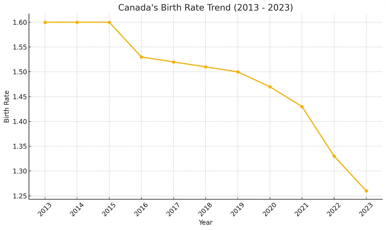 캐나다의 출산율도 마찬가지로 지속적으로 낮아지는 추세이며, 2022년에는 역사상 최저인 1.33명까지 떨어졌고, 2023년에는 1.26명으로 하락해 더욱 심각한 수준을 보이고 있다. 주거비, 물가등이 높은 밴쿠버의 경우, 출산율이 1.1명 수준으로 더 낮게 조사되었는데 이 수치들 모두 인구 유지에 필요한 출산율인 2.1명을 크게 밑도는 수준이다.
