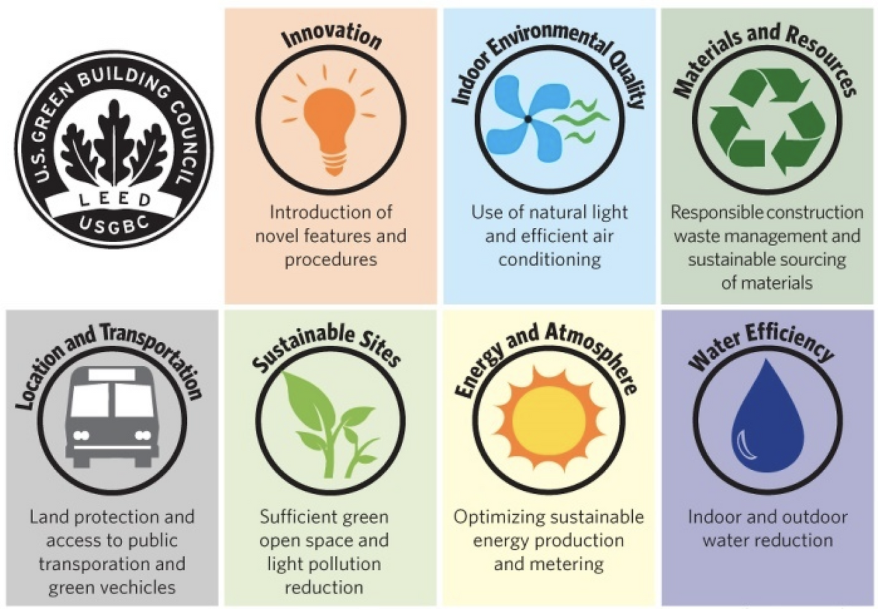 LEED 인증은 아래의 이미지에서 보는 것과 같은 다양한 범주에서 점수를 얻어야 하며, 점수에 따라 건물은 Certified, Silver, Gold, Platinum 네 가지 등급으로 분류된다. 인증획득을 위해 에너지 효율성, 물 사용, 실내 공기 질, 자재 선택 등 지속 가능성을 전반적으로 평가하기 때문에 전 세계적으로 친환경 건축의 표준이 되고 있다.