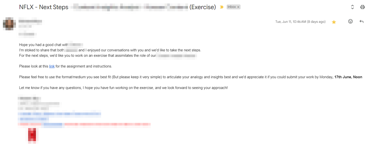 답변 제출에도 사실 우여곡절이 좀 있는데 그건 전형 프로세스랑 상관없으니 일단 생략하고, 답변 제출은 6/17(월) 오전 11시 반쯤 이메일로 했고 리크루터분은 내가 제출한 답변을 검토하고 다시 연락줄때까지 며칠 걸릴것이니 기다려달라고 답변을 하셨다. 하루, 이틀, 그리고 일주일이 지났다. 면접의 경우 바로바로 결과를 알려줬던만큼 과제를 내고 시간이 지나도 연락이 없자 나는 초조해지기 시작했다. 넷플릭스의 답변을 기다리는 동안 나는 자꾸만 내 답변을 읽으면서 '이 정도로는 충분하지 않다'고 말하며 고개를 절레절레하는 넷플릭스 직원들이 상상되어서 일주일 정도의 기간동안 엄청난 스트레스를 받았다. 일주일이 지나고는 그때부터는 뭔가 초월했는지 마음을 내려놓고 내가 떨어졌겠거니~하고 생각을 많이 하면서 지냈다.