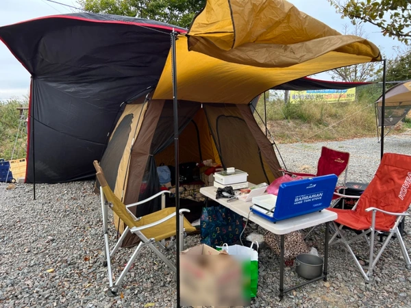 첫 번째 캠핑은 여름 직전이라서 우리의 텐트가 완벽히 닫히지 않아도 불편한 게 없었다. 여자 셋인데 뭐가 무서워라는 생각까지 할 정도였고, 텐트 입구는 캠핑용 전기냉장고로 막고 있었으니.. 또 자리도 좋아서 시선도 신경 쓰지 않아도 됐었다.