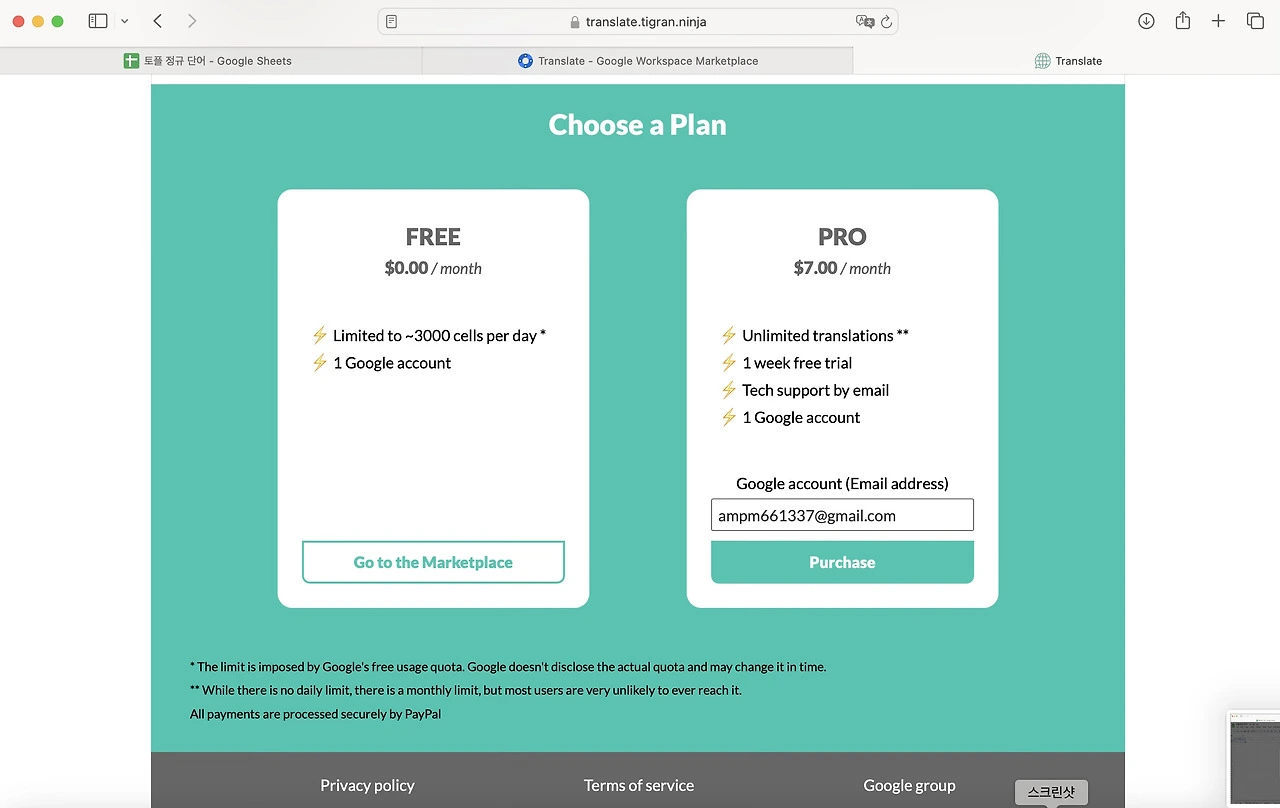 선생님들 같은 경우엔 정말 많이 쓰실 것 같으면 오른쪽. 일주일 무료고 한 달에 7달러 정도 됐다.