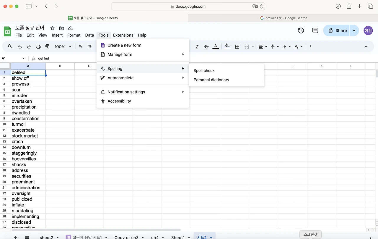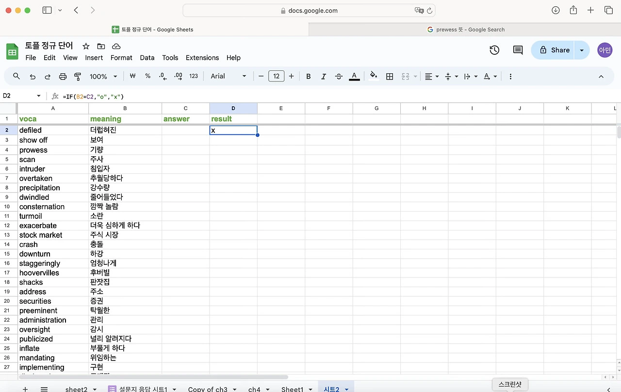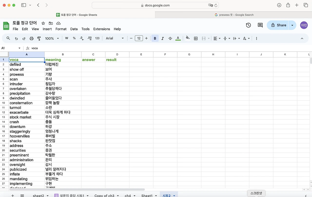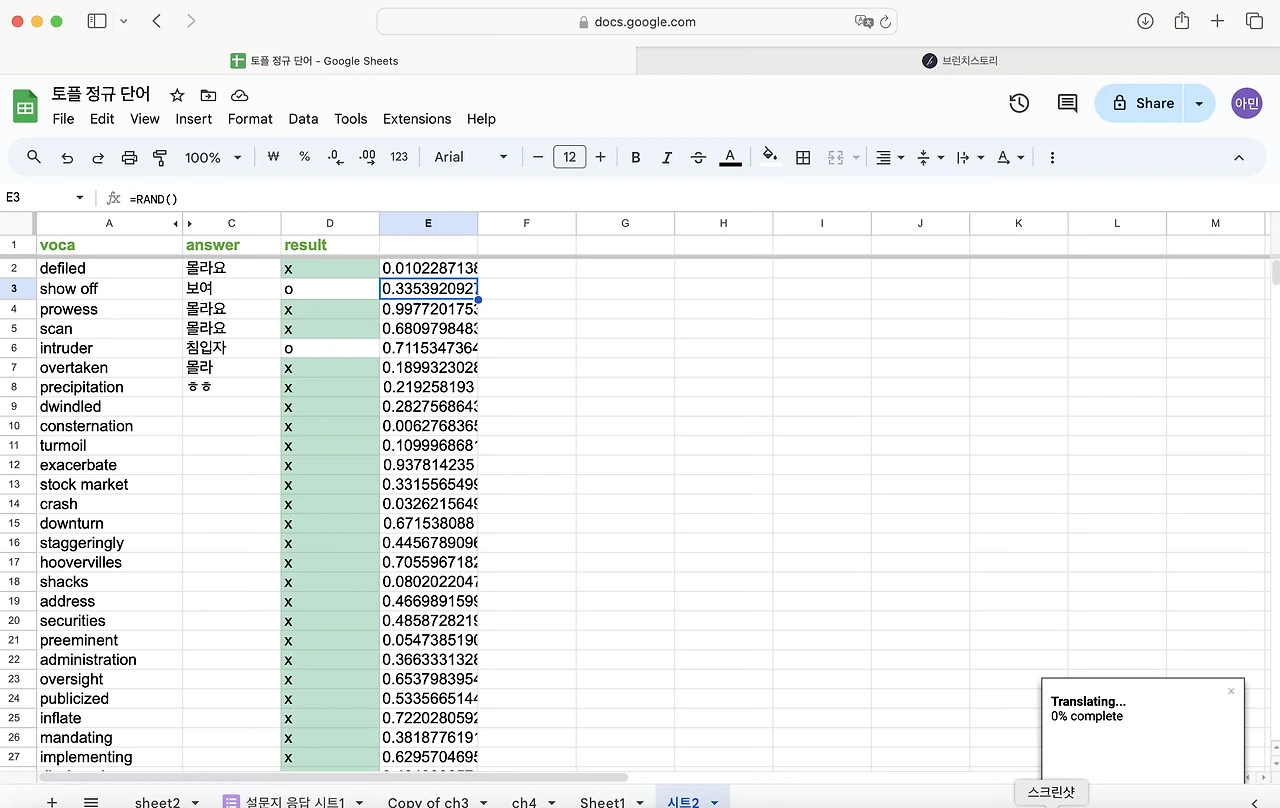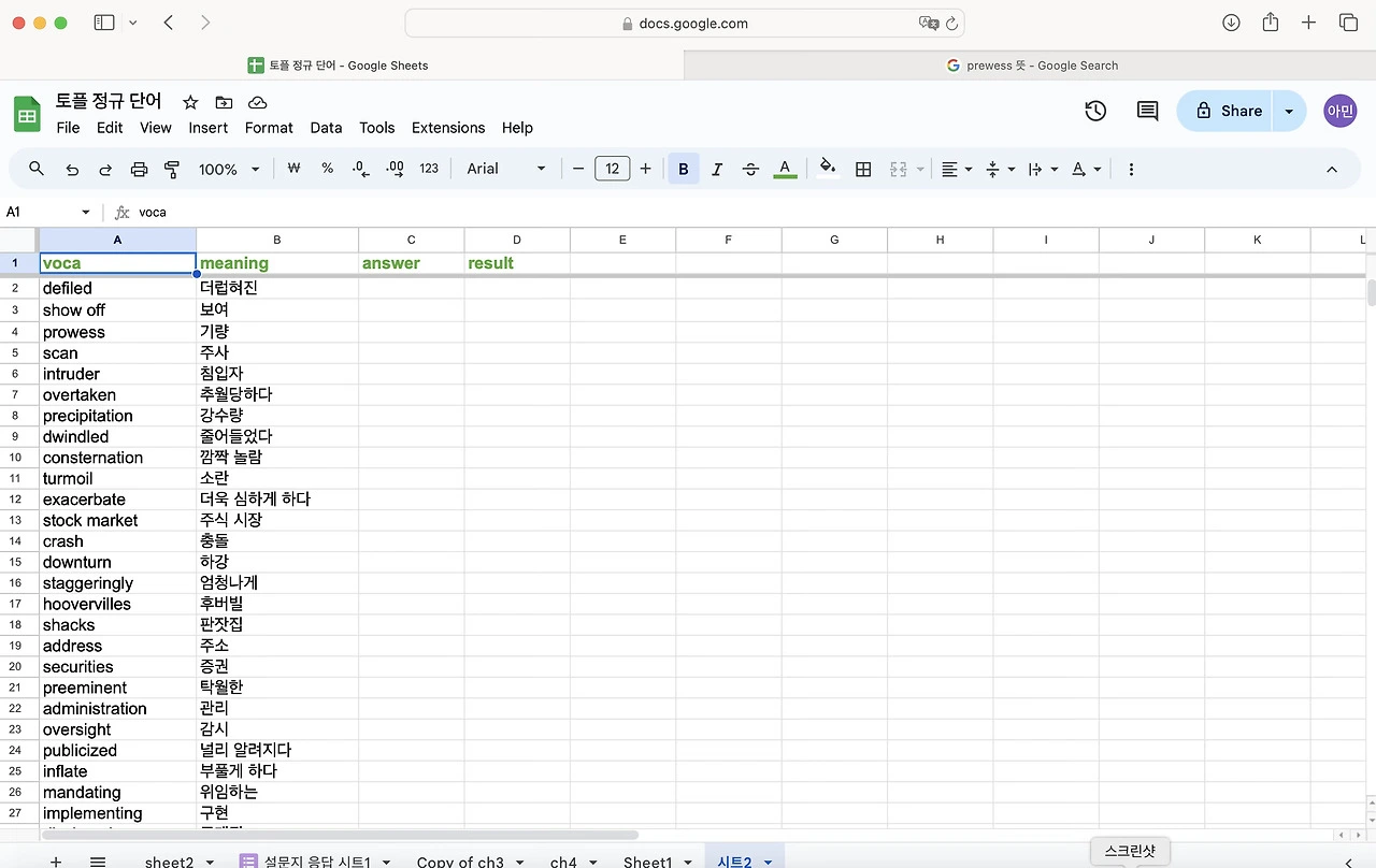 토플 공부를 하면서 단어를 엄청 외우기 시작했다. 난 눈으로 외우는 편이라 한손에 들어오는 단어장을 선호한다. 엑셀로 정리 해두고 뽑아두면 외우기 좋았다. 그런데 아무래도 종이 단어장은 순서가 정해져 있어서 내가 제대로 외웠는 지를 알 수가 없다. 그래서 구글 스프레드로 단어장과 단어 시험지를 만들어 보기로 했다. 다 읽으신 뒤에 따라하길 추천합니다.