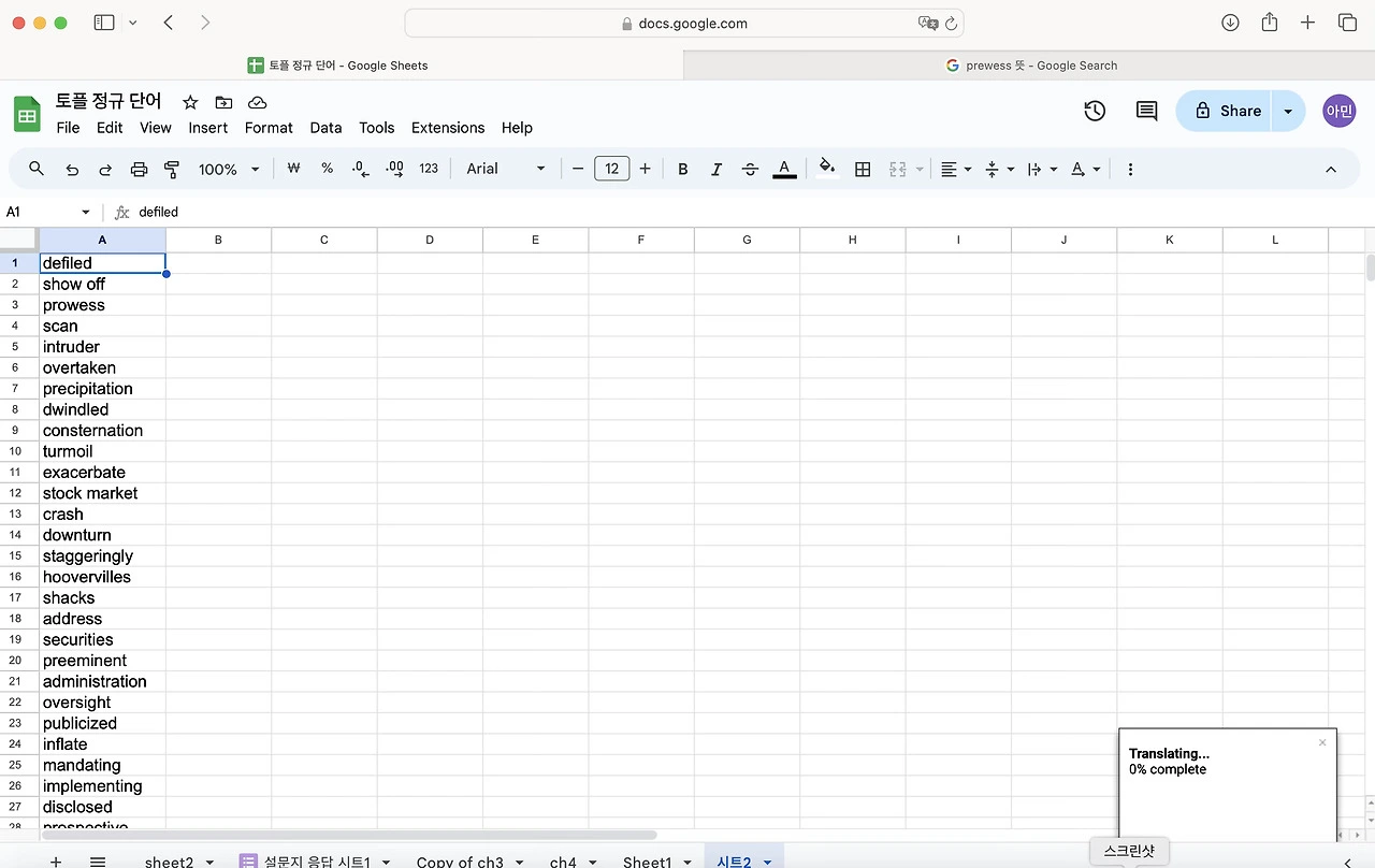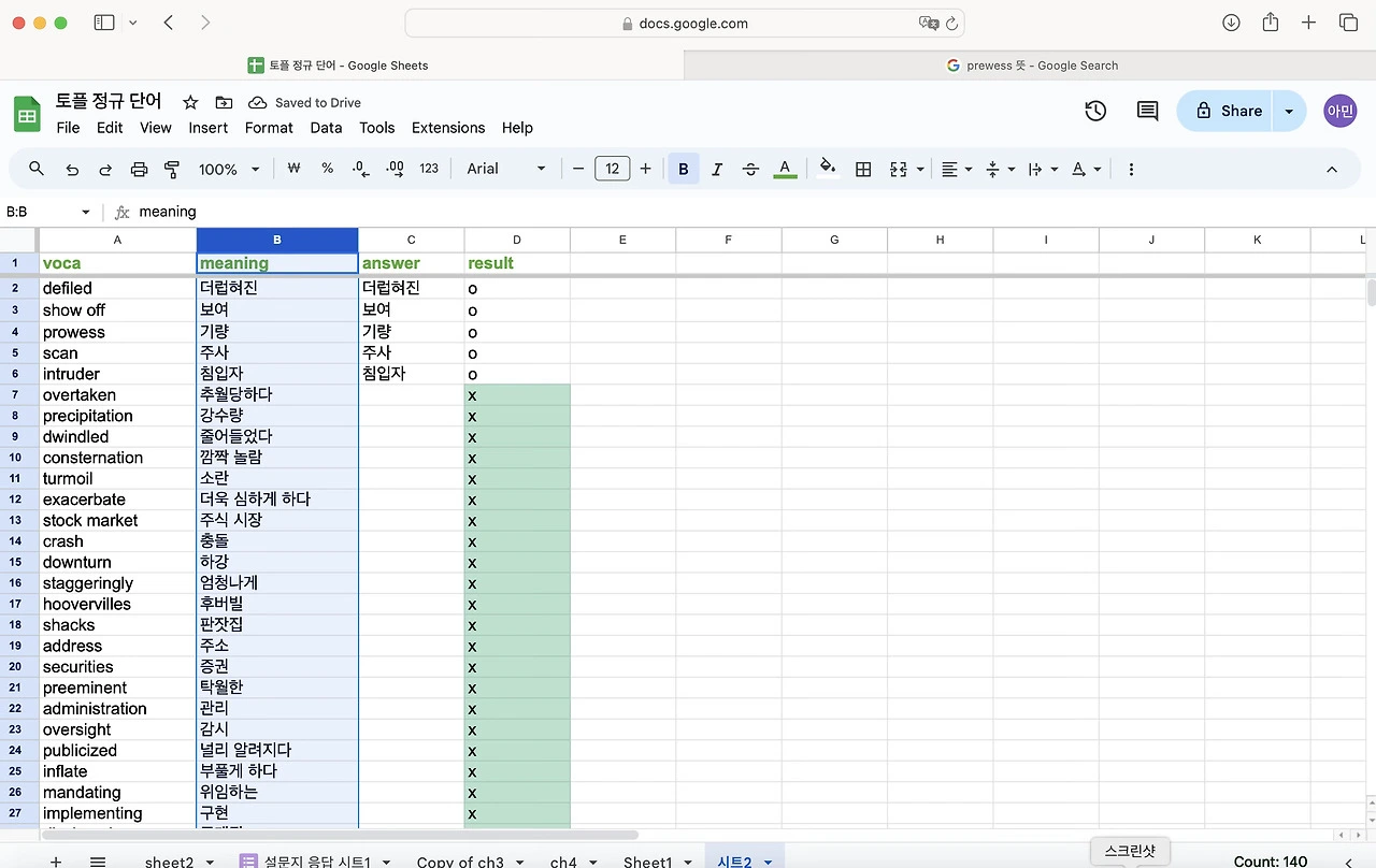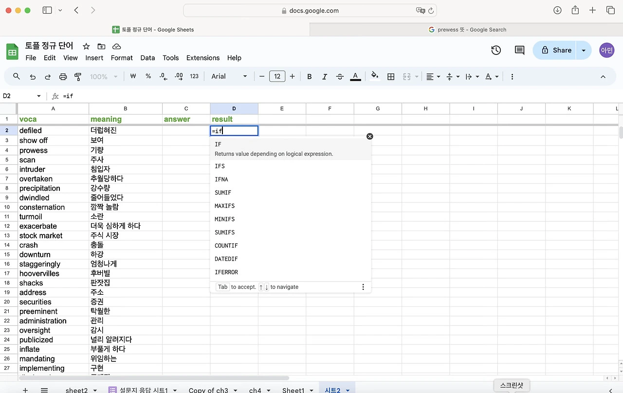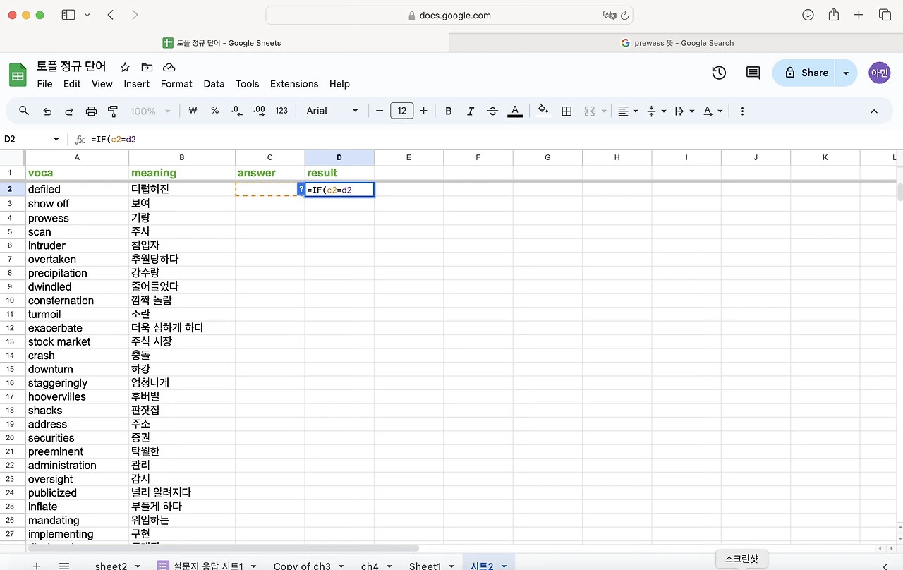 토플 공부를 하면서 단어를 엄청 외우기 시작했다. 난 눈으로 외우는 편이라 한손에 들어오는 단어장을 선호한다. 엑셀로 정리 해두고 뽑아두면 외우기 좋았다. 그런데 아무래도 종이 단어장은 순서가 정해져 있어서 내가 제대로 외웠는 지를 알 수가 없다. 그래서 구글 스프레드로 단어장과 단어 시험지를 만들어 보기로 했다. 다 읽으신 뒤에 따라하길 추천합니다.