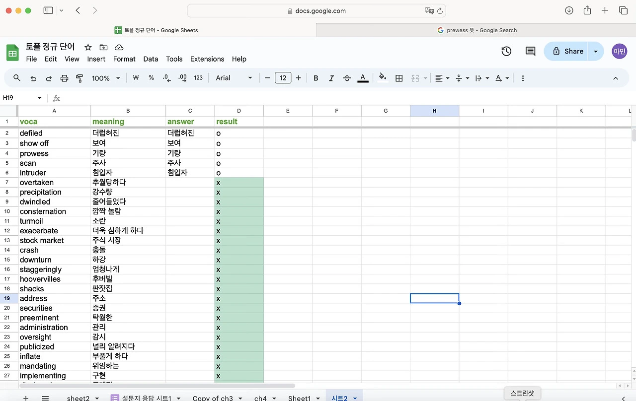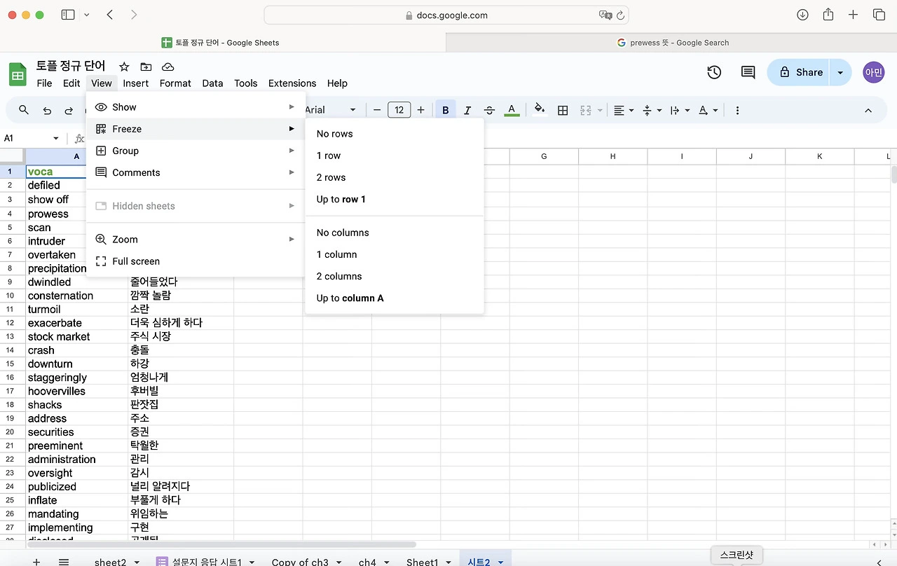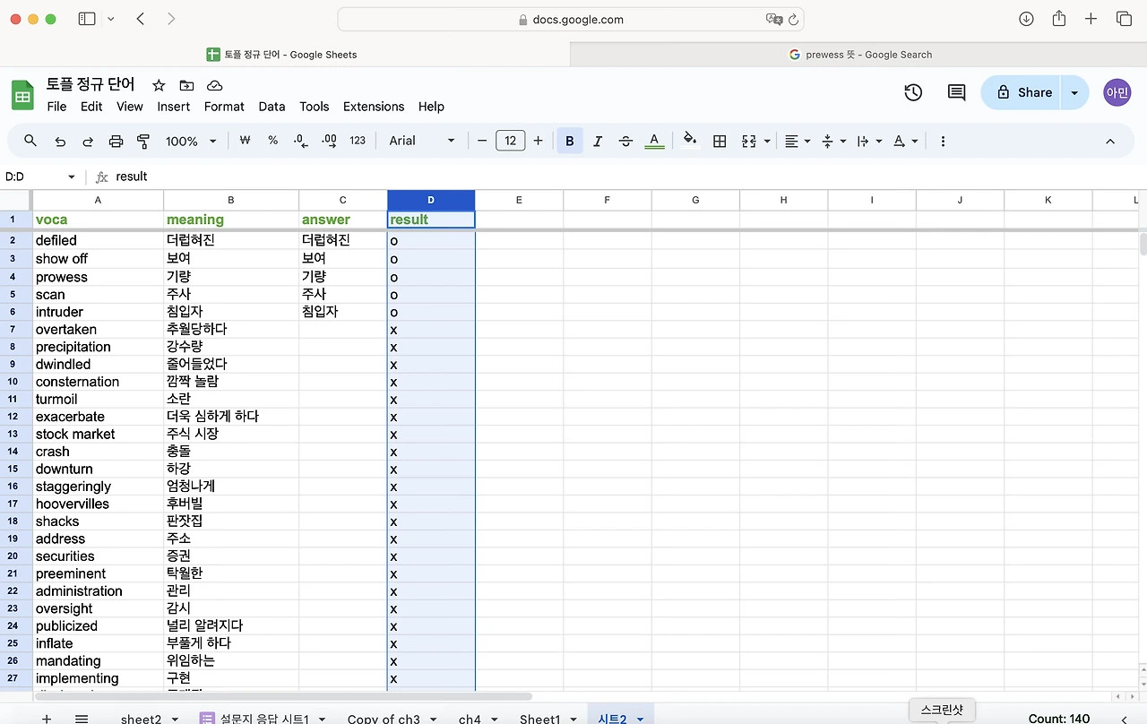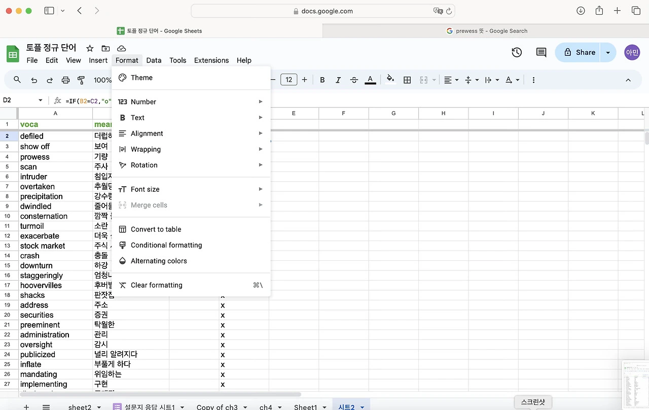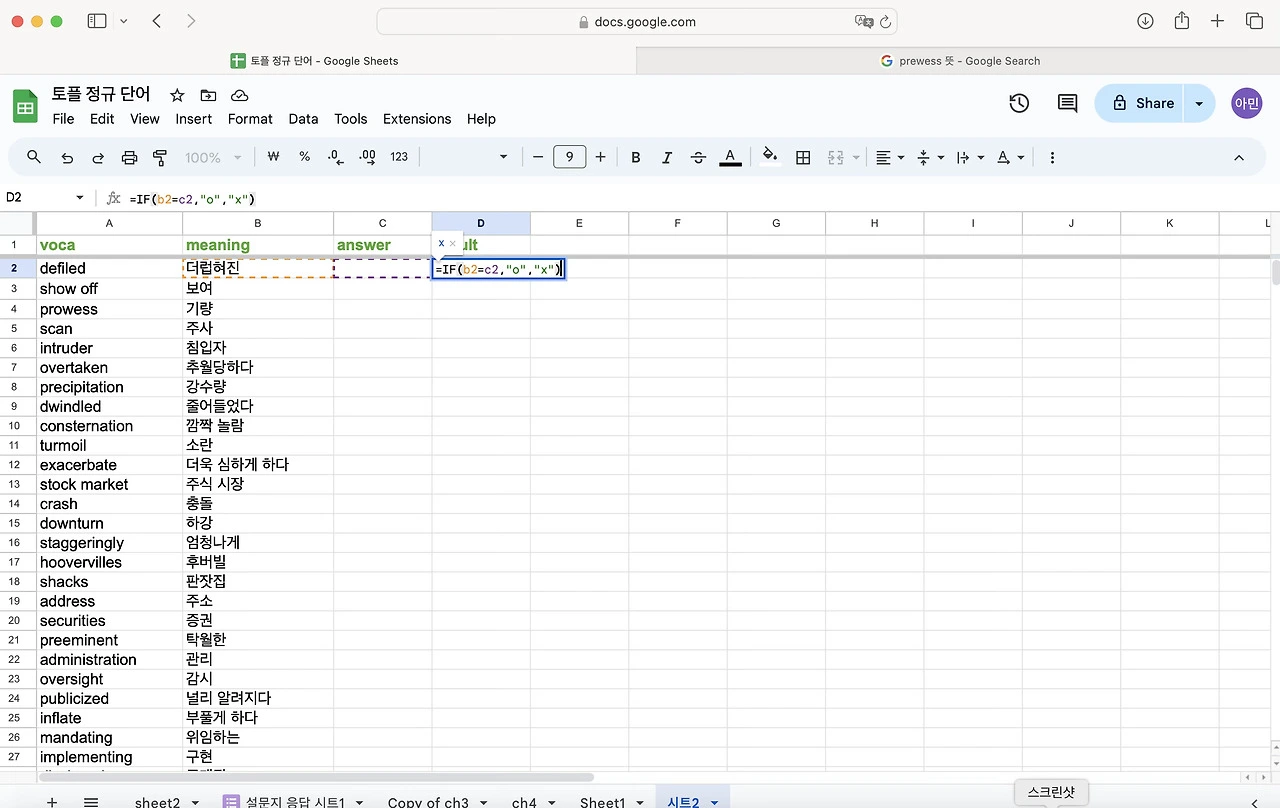 토플 공부를 하면서 단어를 엄청 외우기 시작했다. 난 눈으로 외우는 편이라 한손에 들어오는 단어장을 선호한다. 엑셀로 정리 해두고 뽑아두면 외우기 좋았다. 그런데 아무래도 종이 단어장은 순서가 정해져 있어서 내가 제대로 외웠는 지를 알 수가 없다. 그래서 구글 스프레드로 단어장과 단어 시험지를 만들어 보기로 했다. 다 읽으신 뒤에 따라하길 추천합니다.