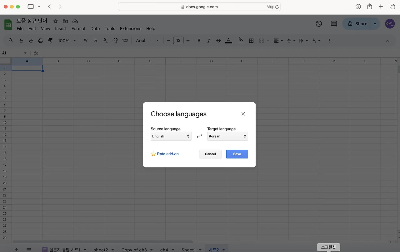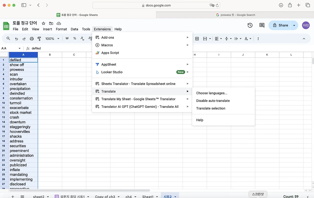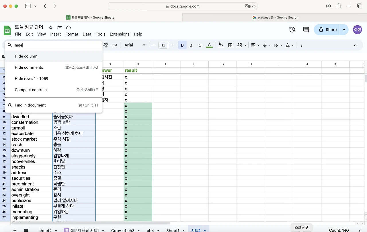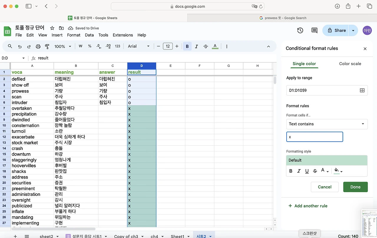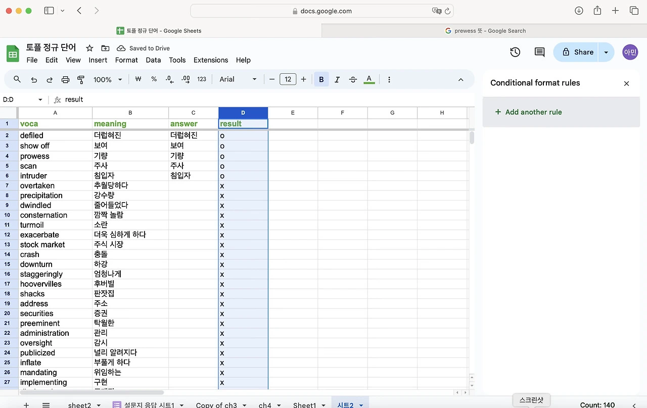 토플 공부를 하면서 단어를 엄청 외우기 시작했다. 난 눈으로 외우는 편이라 한손에 들어오는 단어장을 선호한다. 엑셀로 정리 해두고 뽑아두면 외우기 좋았다. 그런데 아무래도 종이 단어장은 순서가 정해져 있어서 내가 제대로 외웠는 지를 알 수가 없다. 그래서 구글 스프레드로 단어장과 단어 시험지를 만들어 보기로 했다. 다 읽으신 뒤에 따라하길 추천합니다.