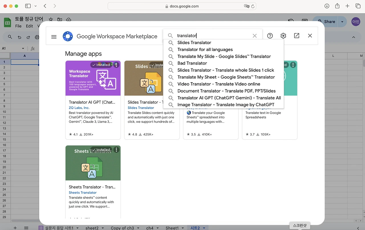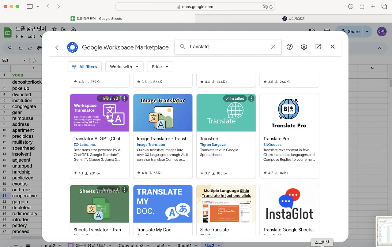 내리다 보면 제일 깔끔하게 생긴 녀석이 있다. 사진으로 봤을 때 윗 줄 세번째 민트색의 translate를 install한다. 설치라는 뜻. 뭐 계정 누르고 continue, allow 누르고 하다 보면 추가 기능 추가 완료다.