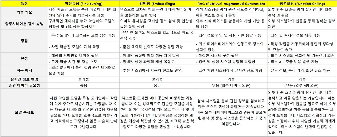 표에서 알 수 있듯이, 파인튜닝과 임베딩 모델은 학습 비용이 크고 정확도를 높이는 데 많은 시간이 걸립니다. 반면, RAG와 펑션콜링은 최근 많은 관심을 받고 있는 방법입니다. 기업에서 신뢰할 수 있는 애플리케이션을 구축하려면 RAG와 펑션콜링을 혼합하여 사용하는 것이 효과적입니다. 그러나 이 방법들은 구현 복잡도가 높아 개발 난이도가 상승합니다.