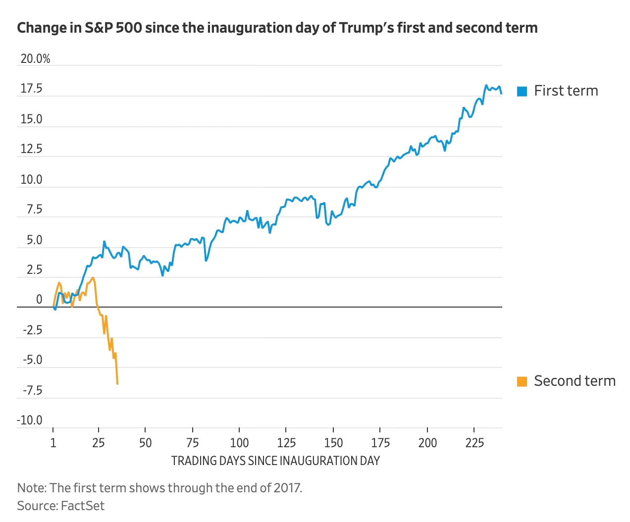 첫 번째 임기와는 완전히 다른 모습이다. 1기 때는 첫 100일 동안 5% 상승했는데, 이번엔 정반대다. 무엇이 달라졌을까?