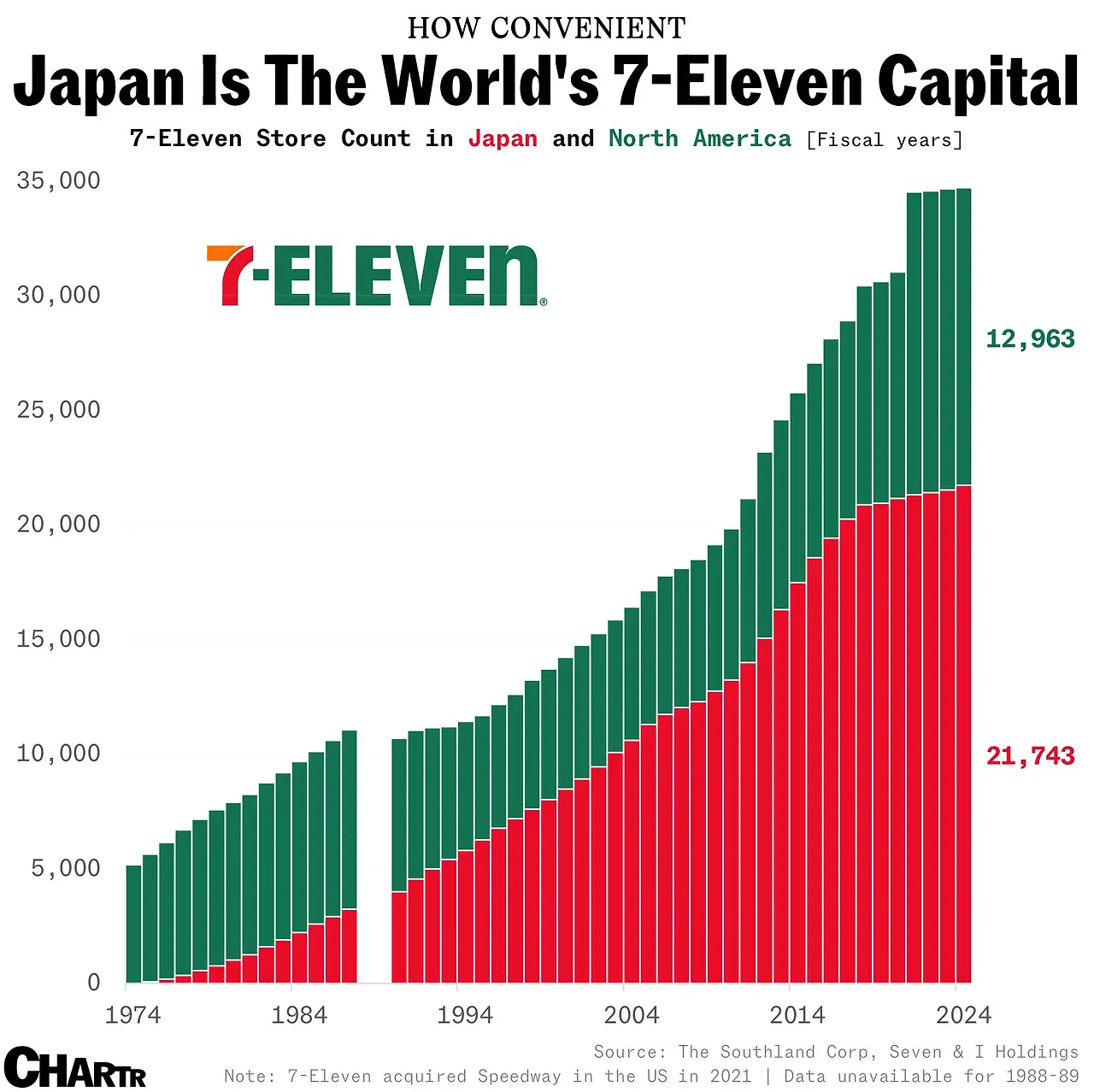 2024년 기준 일본 세븐일레븐은 21,743개에 달한다. 전 세계 85,800개 매장의 25%를 일본 혼자 독식하고 있는 셈이다. 1974년 도쿄 도요스에 첫 매장을 연 지 50년, 제자가 스승을 완전히 발라버린 것이다.