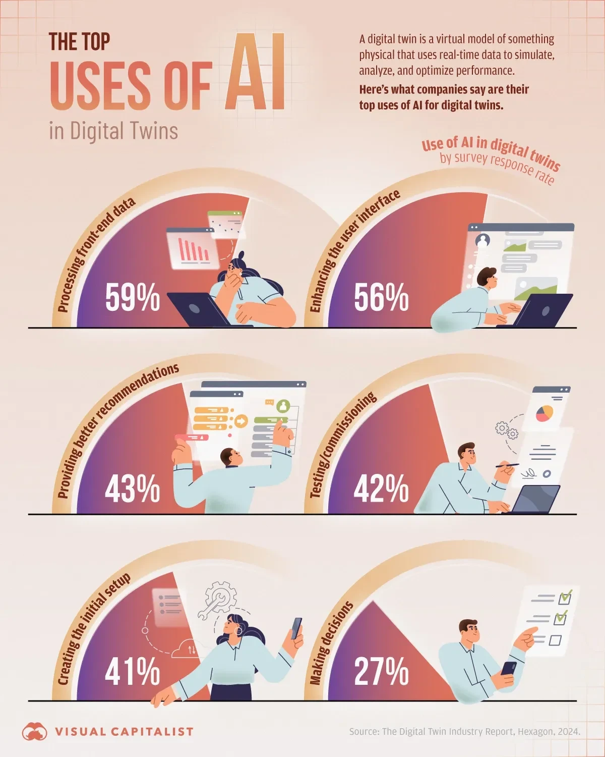 42%는 테스팅과 커미셔닝에 AI를 활용한다. 새로운 시스템이나 제품을 실제 환경에 적용하기 전, 디지털 트윈에서 AI가 무수히 많은 시나리오를 동시에 테스트한다. 실패 비용을 제로로 만드는 마법이다. 초기 설정(41%)과 의사결정(27%)에도 AI가 적극 활용되면서, 복잡한 시스템 구축을 자동화하고 수많은 변수를 고려한 최적의 결정을 내려준다.