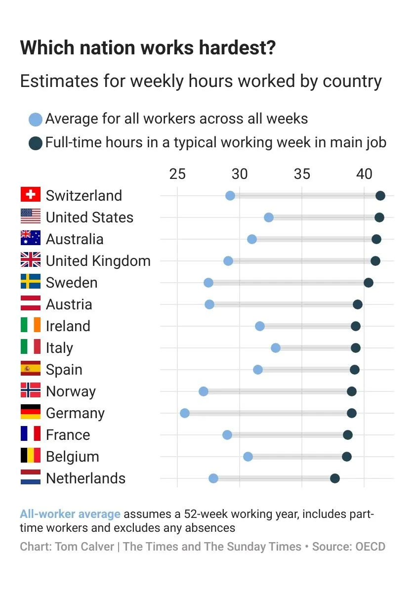 스위스의 정규직 근로자들은 주당 41시간을 일한다. 차트에서 보면 가장 오른쪽 끝에 위치할 정도로 긴 시간이다. 하지만 스위스는 1인당 부의 세계 1위 국가다. 여기서 핵심은 일하는 시간이 아니라 일의 품질과 효율성이라는 점이다.