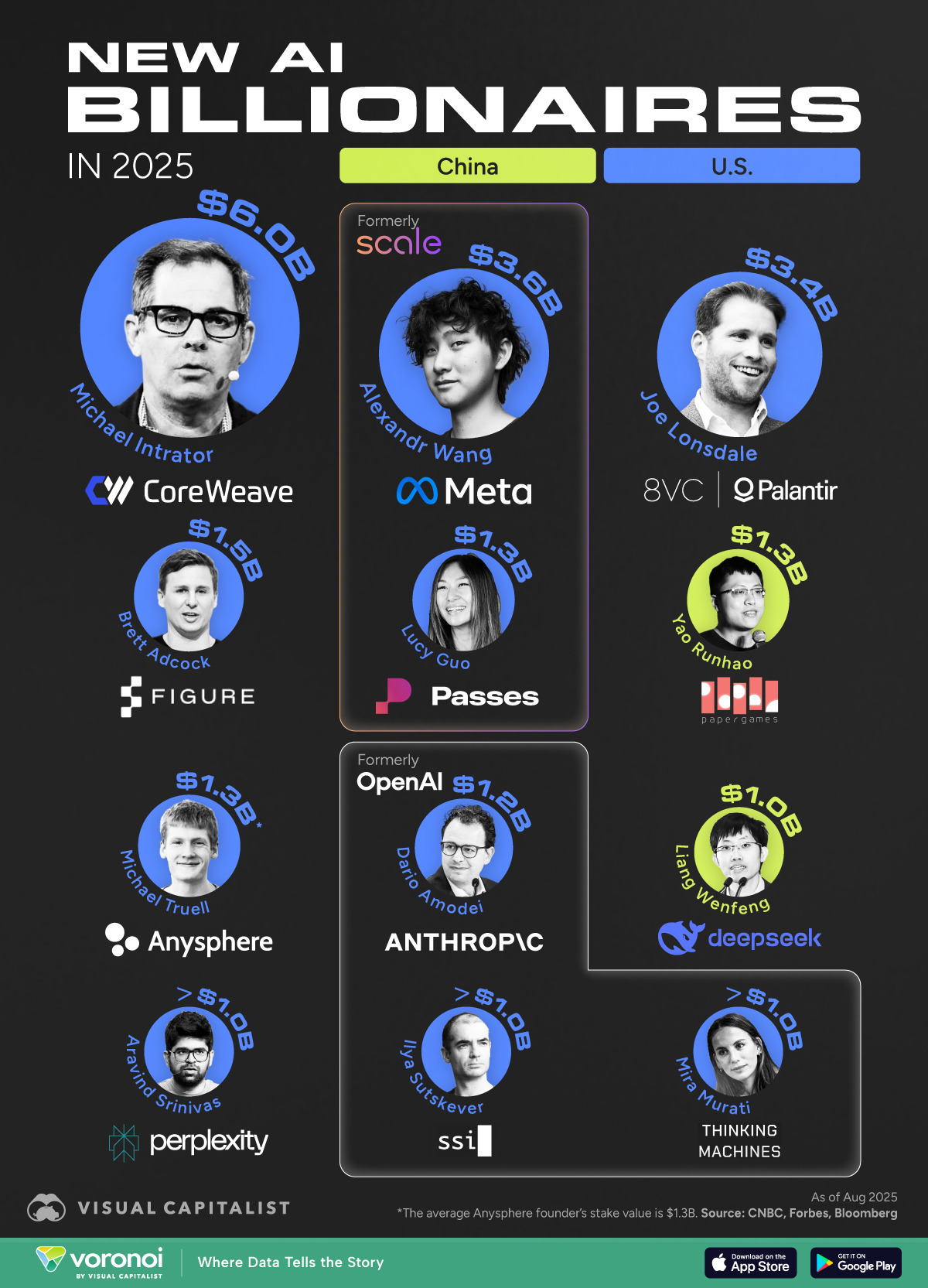 AI 붐 덕분에 새롭게 억만장자가 된 인물들이 속속 등장하고 있다. 비주얼 캐피털리스트(Visual Capitalist) 자료에 따르면, 2025년 총 12명의 새로운 AI 억만장자가 탄생했으며, 이들의 총 자산 규모는 무려 200억 달러(약 28조원)에 달한다.