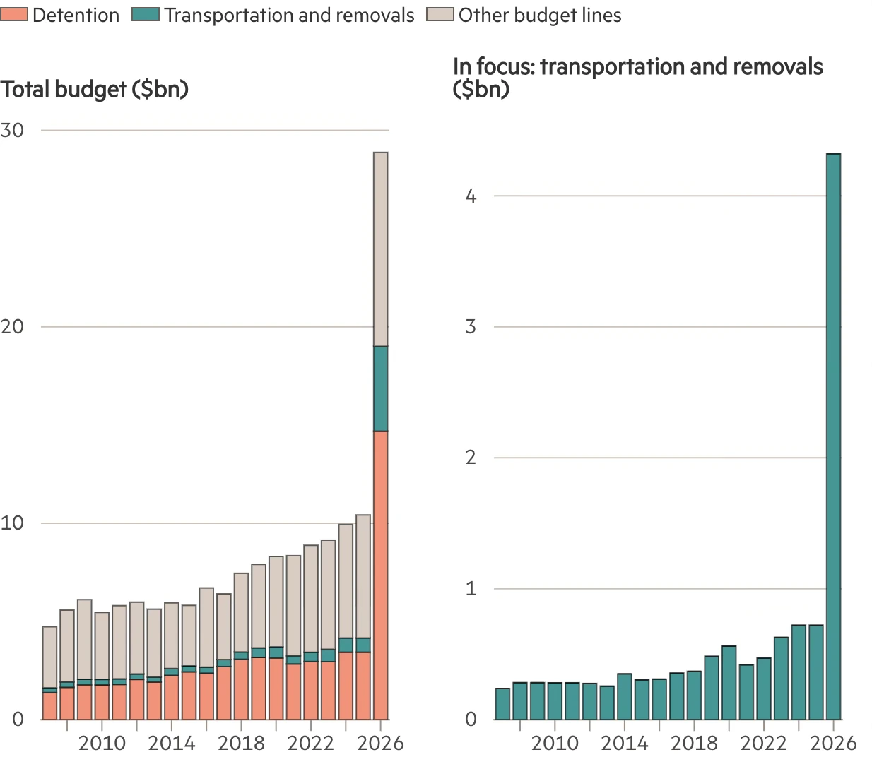 트럼프 행정부가 통과시킨 이민 단속 예산은 그야말로 천문학적이다. 총 1,700억 달러(약 238조 원)가 이민 단속과 국경 보안에 투입되며, 이 중 이민세관단속국(Immigration and Customs Enforcement, ICE)이 받는 750억 달러(약 105조 원)만으로도 미국에서 가장 많은 예산을 받는 연방 법 집행기관이 된다.
