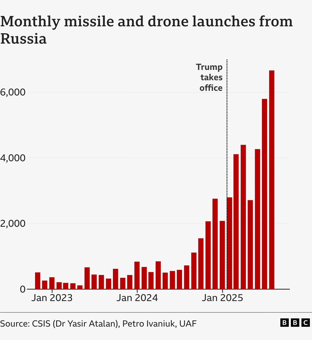 트럼프가 2025년 1월 대통령에 취임한 이후 러시아의 우크라이나 공격이 기하급수적으로 증가했다. 2023년부터 2024년까지 월 평균 1,000회 안팎이던 미사일과 드론 공격이 트럼프 취임 후 4,000~6,000회로 폭증했다. 이는 단순한 우연이 아니다.