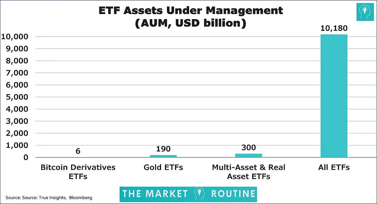 ETF 시장의 놀라운 역설이 숫자로 드러났다. 전 세계 ETF 운용자산 총 10.18조 달러(약 14,252조원) 중에서 금 ETF는 1,900억 달러(약 266조원), 부동산·원자재 등 대체자산 ETF는 3,000억 달러(약 420조원), 그리고 요즘 핫한 비트코인 파생상품 ETF는 고작 60억 달러(약 8.4조원)에 불과하다.