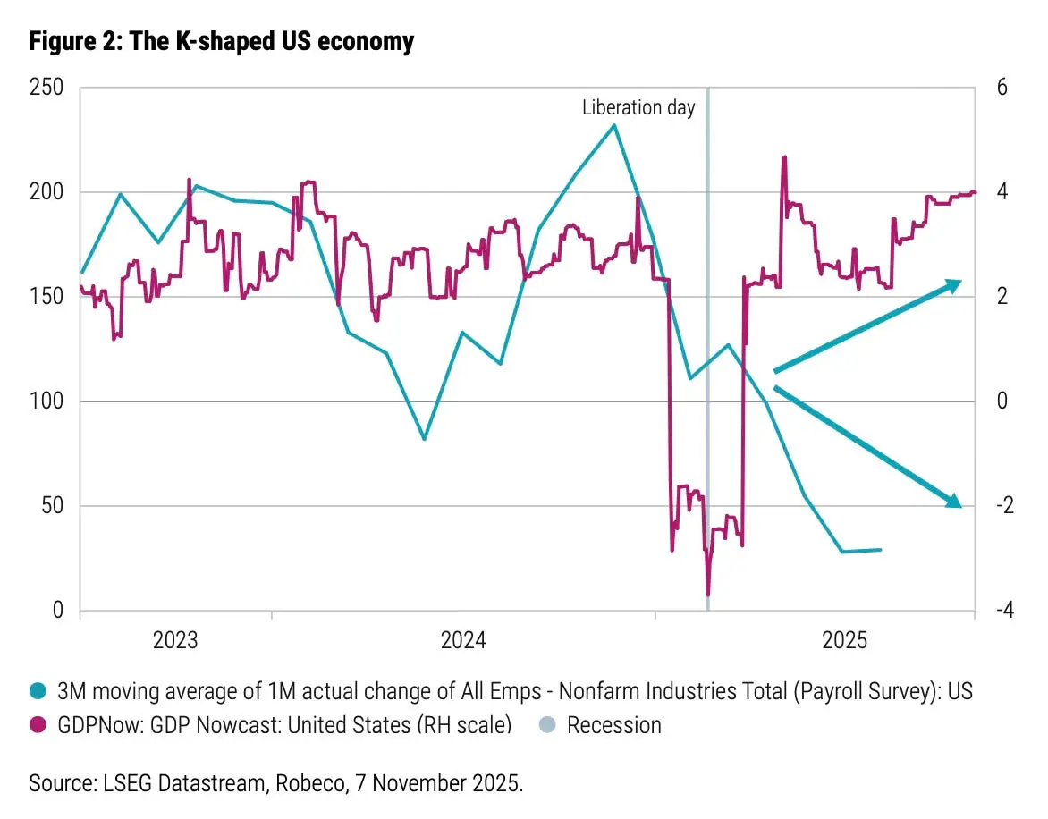 2024년 말 트럼프(Trump)의 관세 정책이 본격화된 "해방의 날(Liberation Day)" 이후, 미국 경제는 기묘한 현상을 보이고 있다. 애틀랜타 연준(Atlanta Fed)의 GDPNow 지표는 플러스 4% 영역까지 회복했지만, 비농업 고용 증가 추세는 마이너스 영역으로 급락했다. 경제성장과 고용이 완전히 반대 방향으로 움직이는, 이른바 K자형 회복이다.