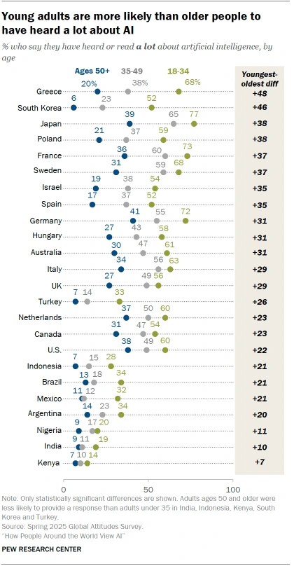 퓨리서치센터(Pew Research Center)가 25개국을 대상으로 실시한 2025년 봄 조사에서, 청년층이 고령층보다 AI를 더 많이 알고 있다는 결과가 거의 모든 나라에서 나타났다. 일본 +38%포인트, 폴란드 +38%포인트, 프랑스 +37%포인트, 스웨덴 +37%포인트. 미국은 상대적으로 격차가 작은 편인데도 +22%포인트다.