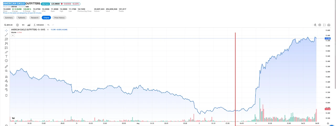 결과는? 새 캠페인 론칭 이후 아메리칸 이글 주가가 20% 이상 상승했습니다.