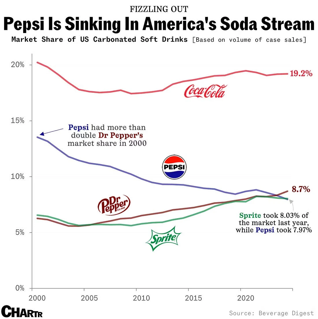 2024년 현재 미국 탄산음료 시장에서 닥터페퍼와 펩시 모두 8.3% 점유율로 공동 2위에 올랐다. 이는 펩시가 거의 40년간 지켜온 영원한 2위 자리를 잃었다는 뜻이다.